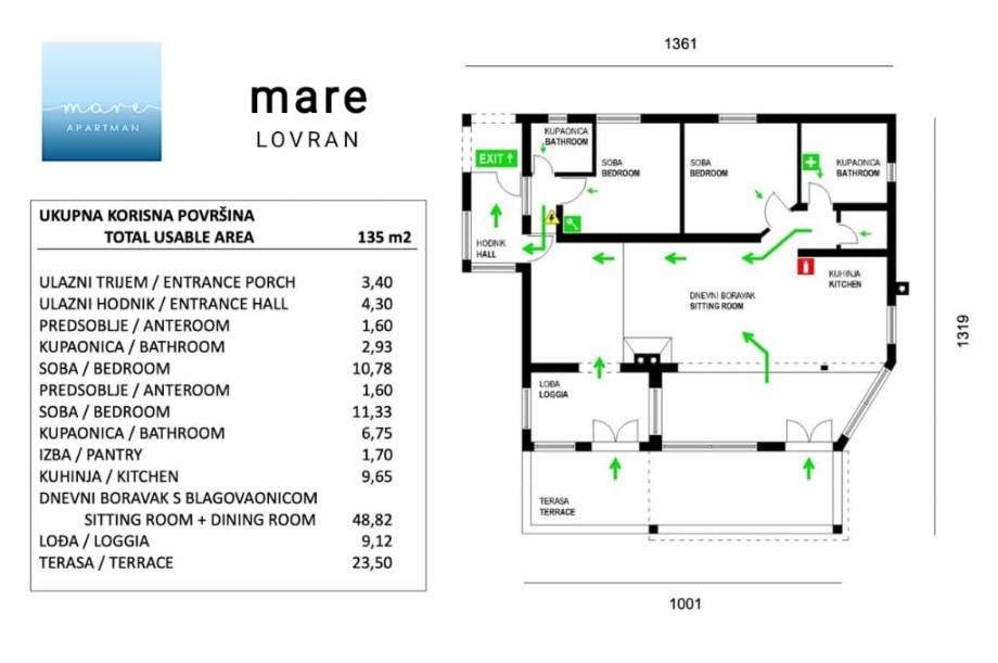 Vlastiti ulaz, 2 spavaće sobe i 2 kupaonice, prostran dnevni boravak s kaminom, kuhinja s blagovaonicom, spremište/vešeraj, loggia, velika terasa djelomično natkrivena.