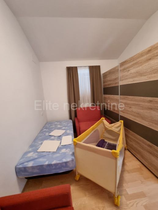 Sastoji se od postaranog hodnika, kupaonice, odvojenog WC-a, 3 spavaće sobe, kuhinje sa blagovaonicom i velikim dnevnim boravkom (open space) s izlazom na balkon sa predivnim pogledom na more.
