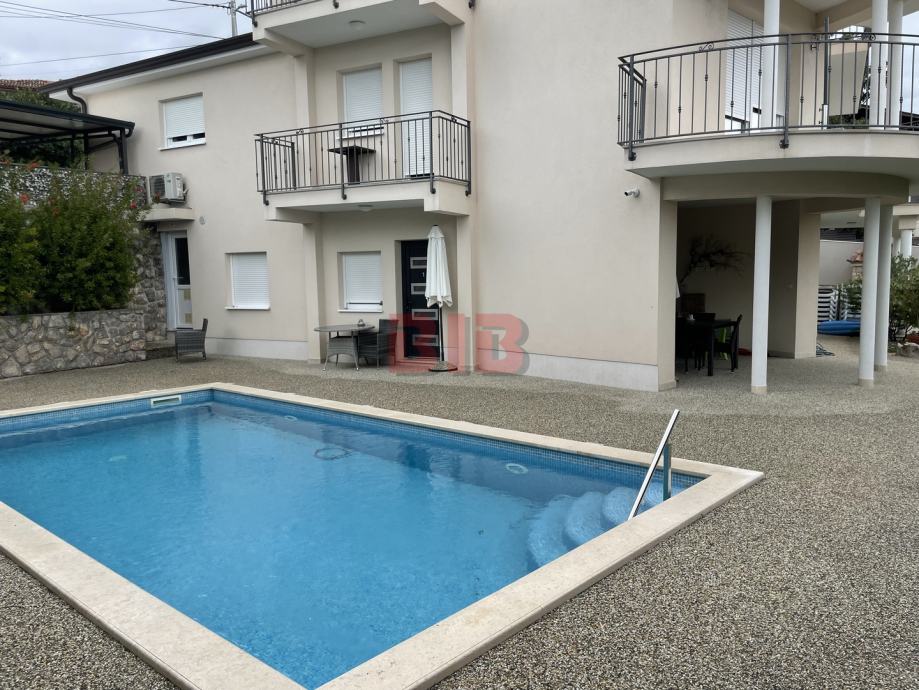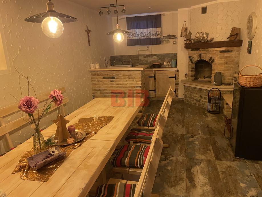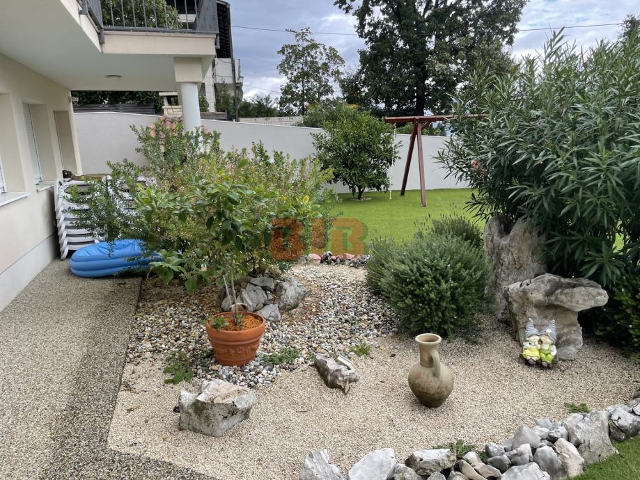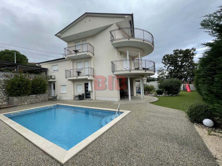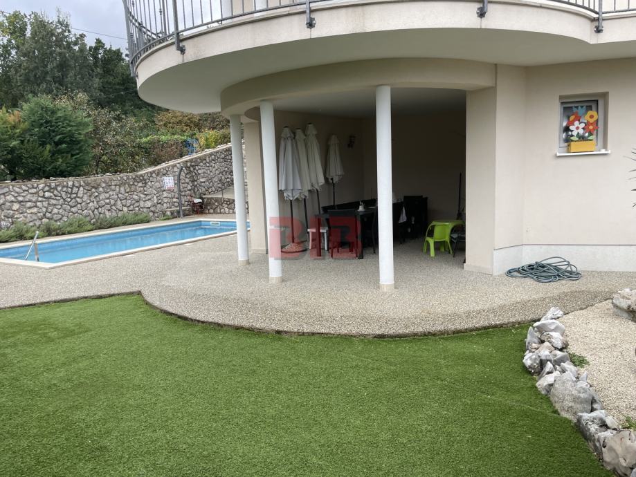 Prostrana okućnica je lijepo uređena i ograđena,a na okućnici se nalazi bazen( 8x4 m) sa sunčalištem,,kamin,natkrivena terasa i natkriven parking( 5 parkinga + 2 u garažama).