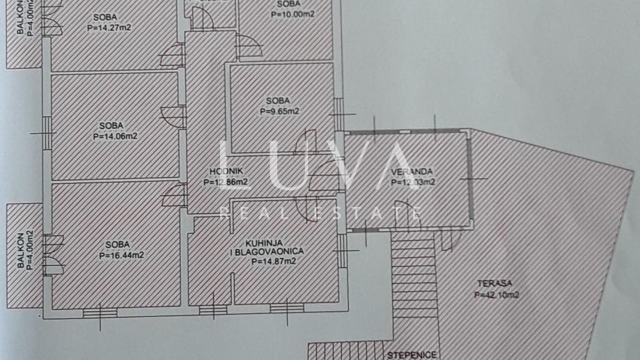 Stanu također pripada i natkrivena veranda(12,03m2), terasa(42,10m2), dva balkona(4m2), vanjske stepenice(10,92m2), te 380m2 okućnice.