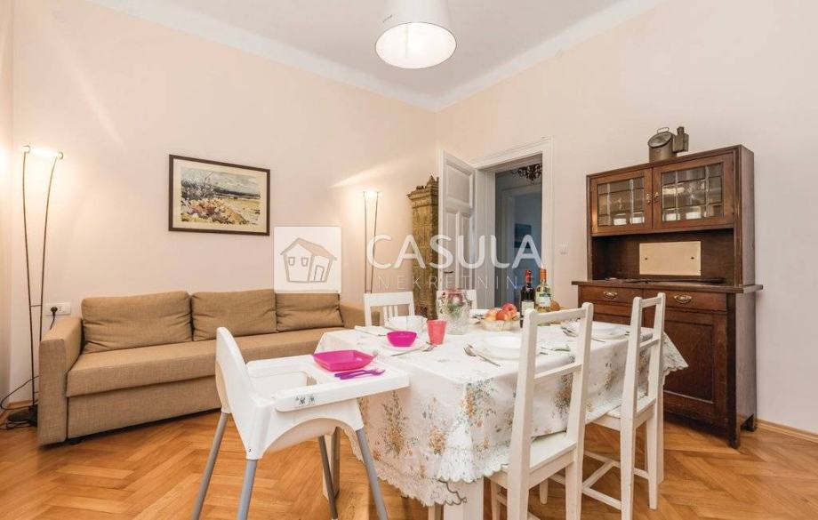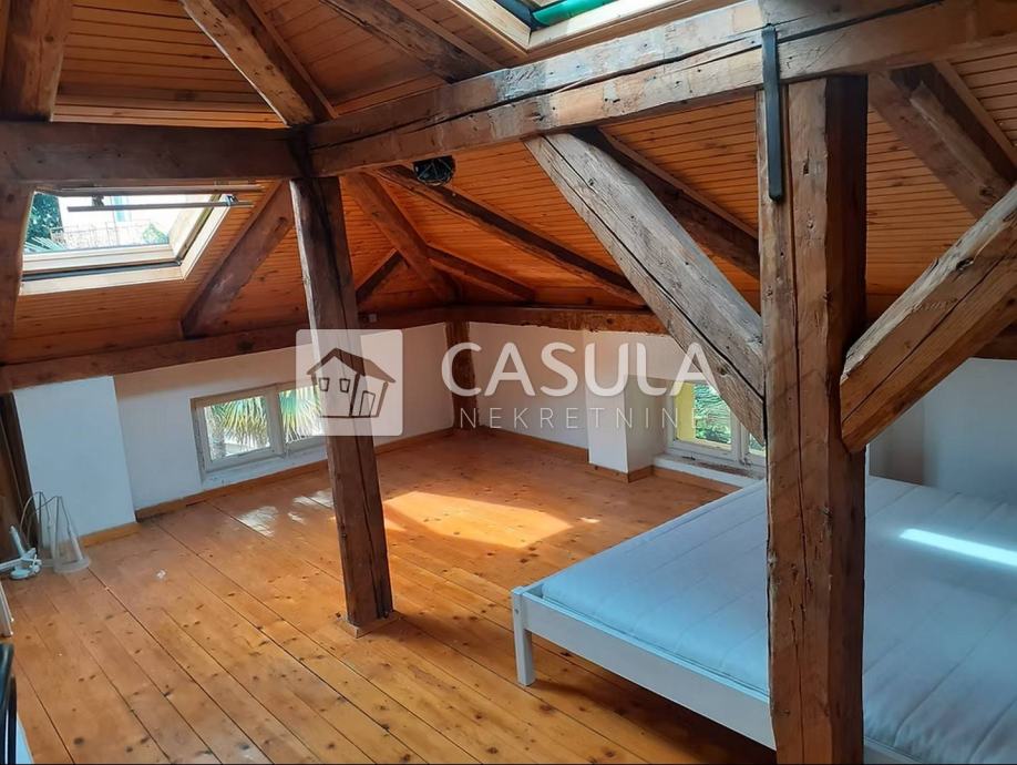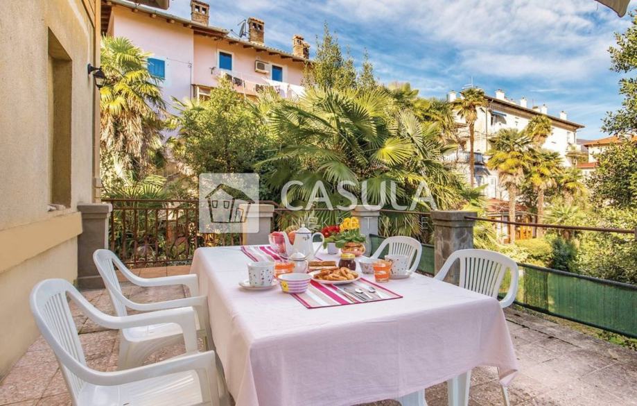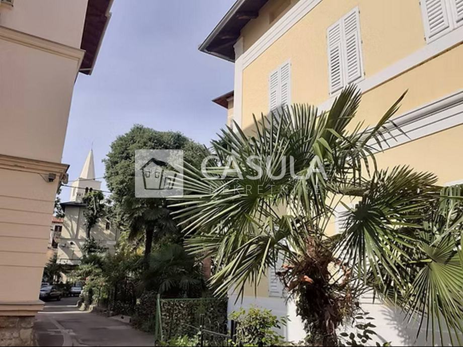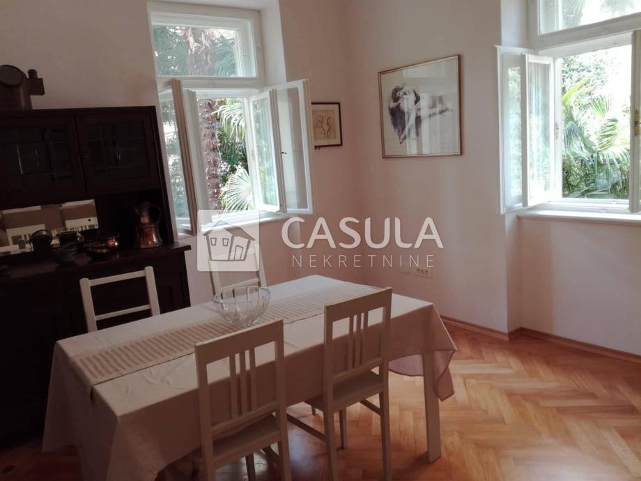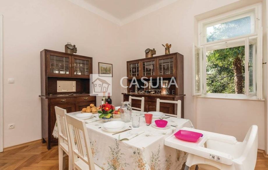 LOVRAN,Ekskluzivna prodaja. Na samo 50 m od mora smjestila se ova predivna povijesna vila sa samo dva stana. Prodajemo stan na 1 katu i dijelu potkrovlja. Stan se sastoji od dvije spavaće sobe, kuhinje, kupaone, dnevnog boravka i velike terase ukupne površine 85 m2 ,Terasa ima površinu 25 m2 ali je pri izračunu kvadrature korišten koeficijent od 0,25. Stanu pripada i prostorija na visokom potkrovlju površine 30 m2 u kojem je smještena soba s tri ležaja (jedan bračni krevet i jedan krevet za jednu osobu) i manje kupatilo. Uz kuću nalazi se 100 m2 terena kao i zemljište na posebnoj katastarskoj čestici površine 240 m2 idealno za parking ili izgradnju bazena. Stan je u odličnom stanju. Pozicija je vrhunska , u centru a opet izolirano od buke. Velika prednost lokacija u blizini mora i parking za više automobila.