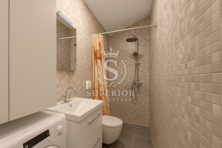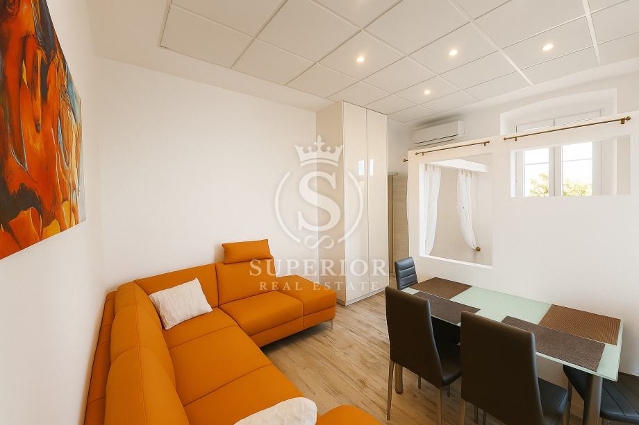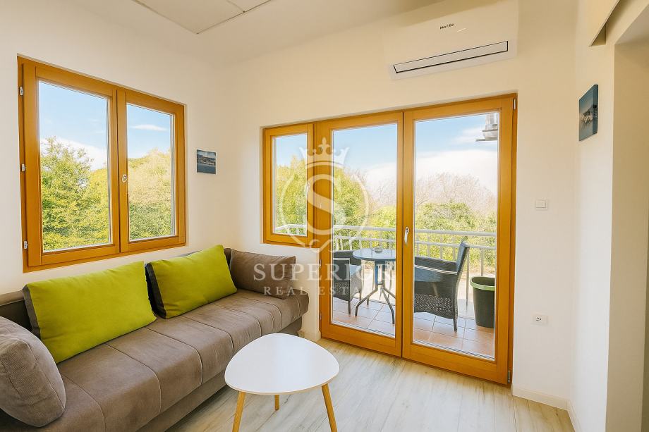 S balkona se pruža čaroban pogled na more, dok unutrašnjost odiše toplinom i funkcionalnošću – svaki kutak pažljivo je osmišljen za uživanje i mir. Spavaći dio odvojen je od dnevnog prostora, a kuhinja je opremljena svime potrebnim za lagodan boravak.