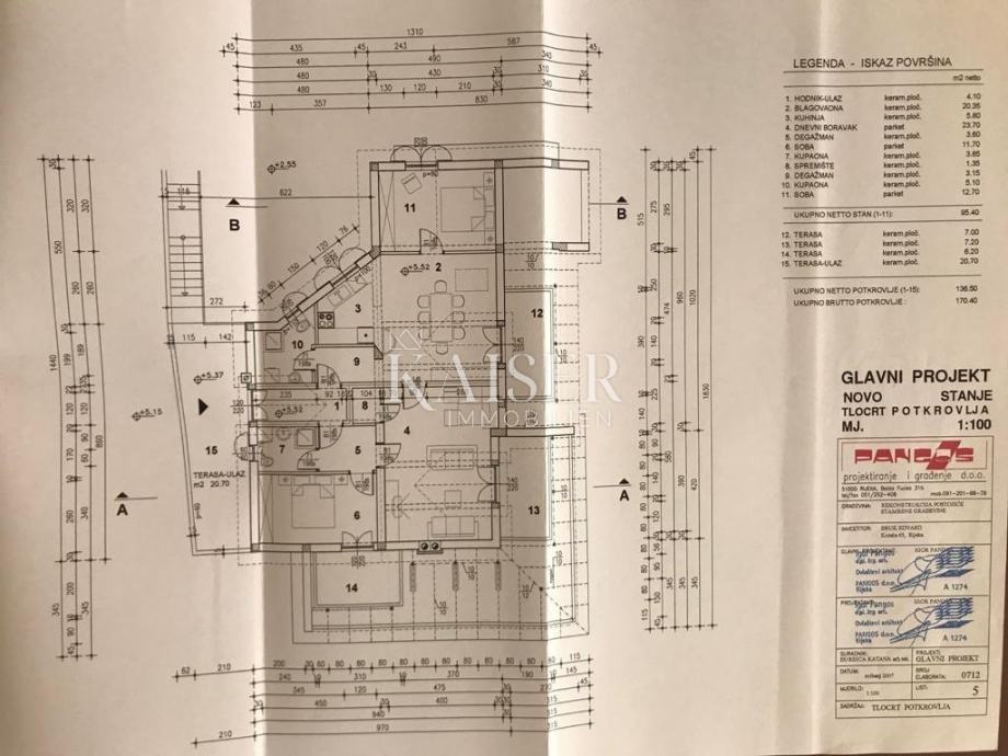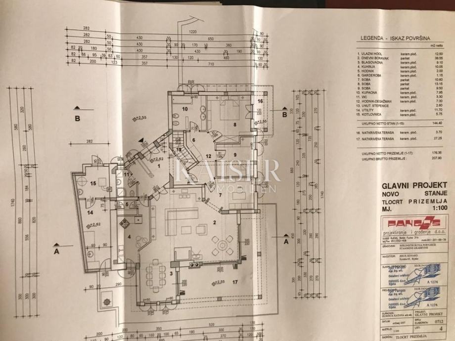 Unutarnje ili vanjsko stubište vodi nas u prizemlje, gdje se nalazi veliki stan od 145 m2 s ogromnim dnevnim boravkom, kuhinjom, blagavaonom, 3 spavaće sobe, 2 kupaone. Tu je i vešeraj, kotlovnica te izlaz na veliku terasu i u prostran vrt.