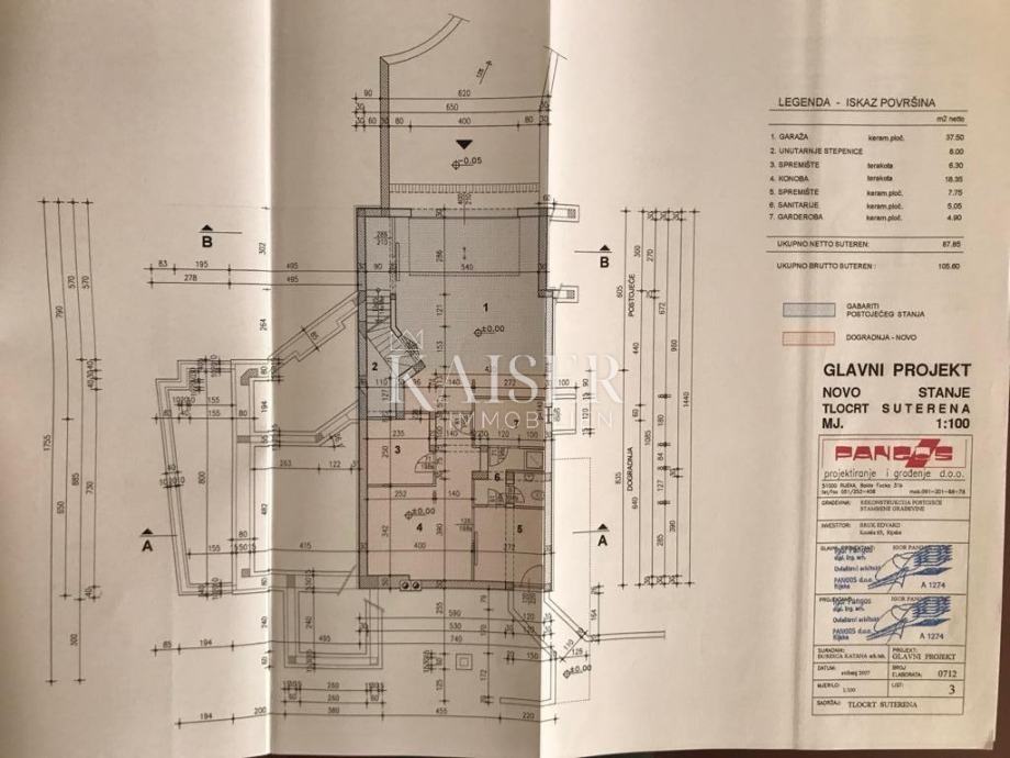 Vila se sastoji od suterena (87 m2) s garažom za 2 automobila, WC-om, kupaonicom i prostorom predviđenim za vinski podrum, tavernu s kaminom i saunu.