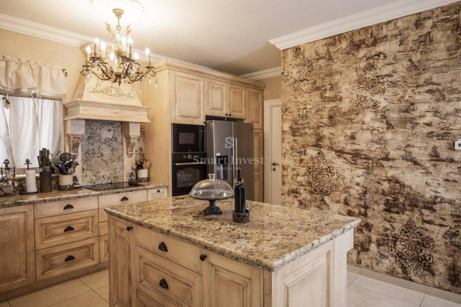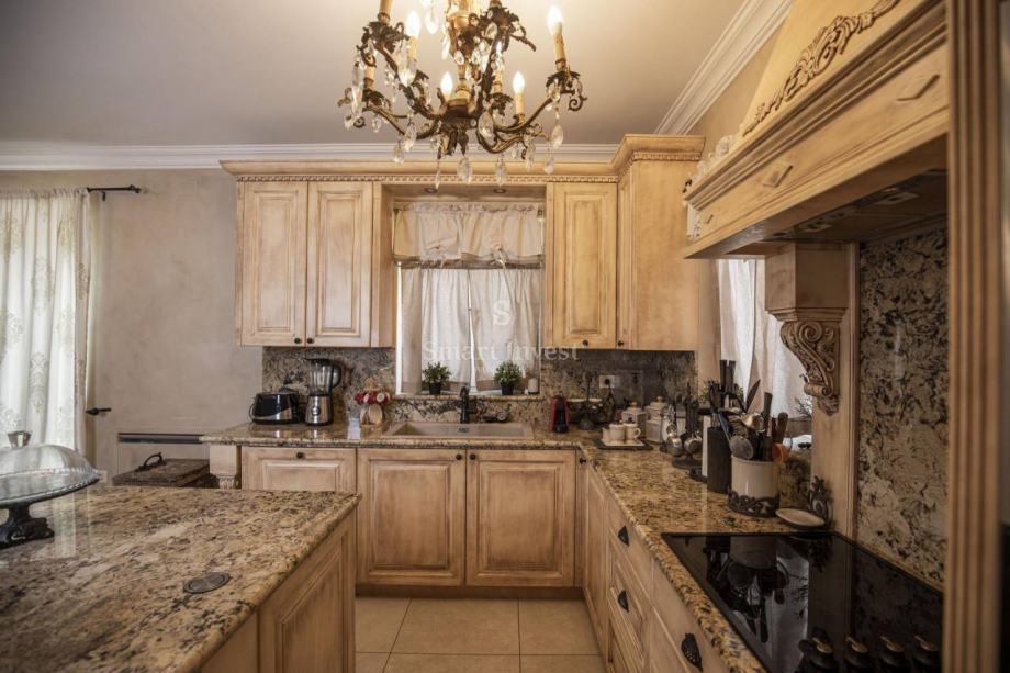 Stropovi su oplemenjeni gipsanim štukaturama, lusteri gipsanim medaljonima, a kuhinjski elementi gipsanim ornamentima.
