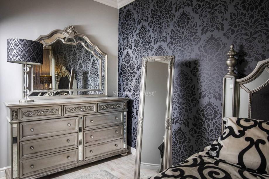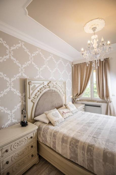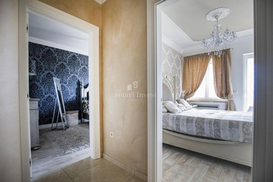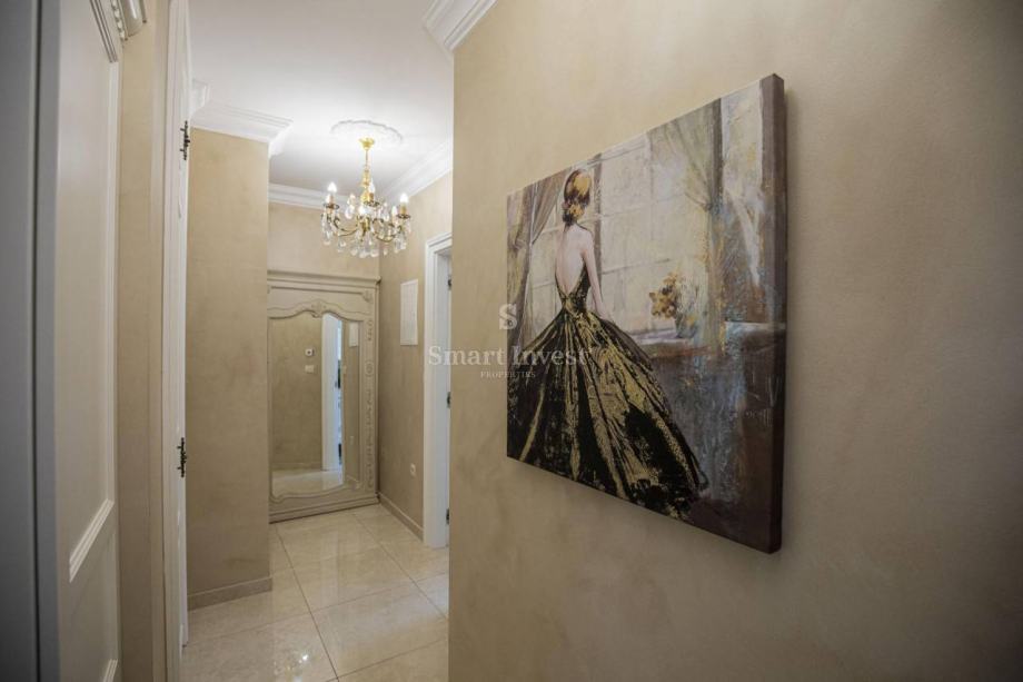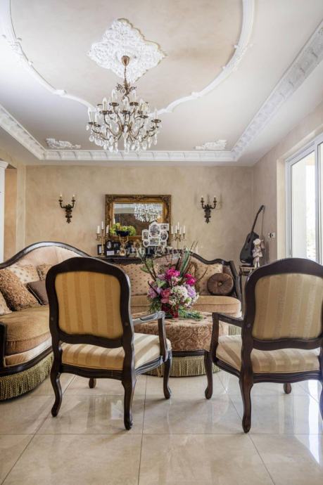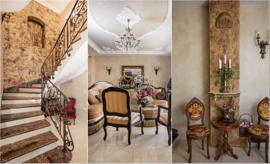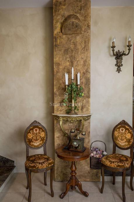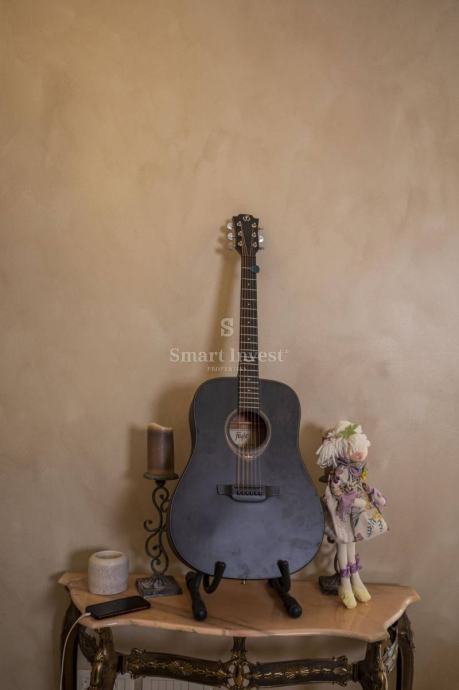 Posebnost uređenja velikog stana je u detaljima, a ponajviše u dekorativnim zidovima gdje su primjenjene razne tehnike: crocodile skin, wood graining, natural crackle finish, color washing, marbleizing, stenciling i toskanski stil.