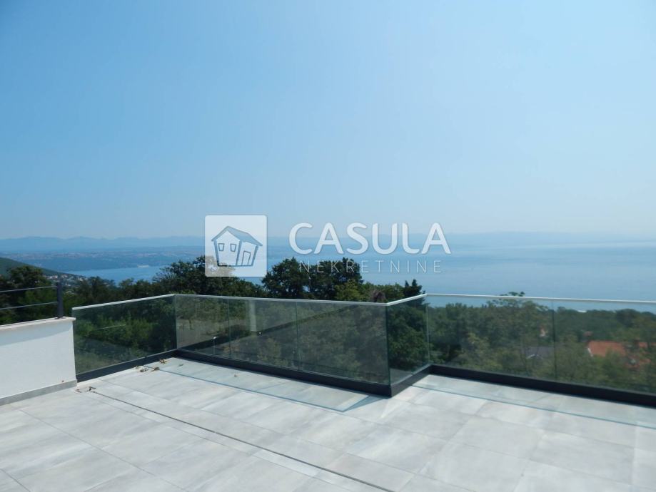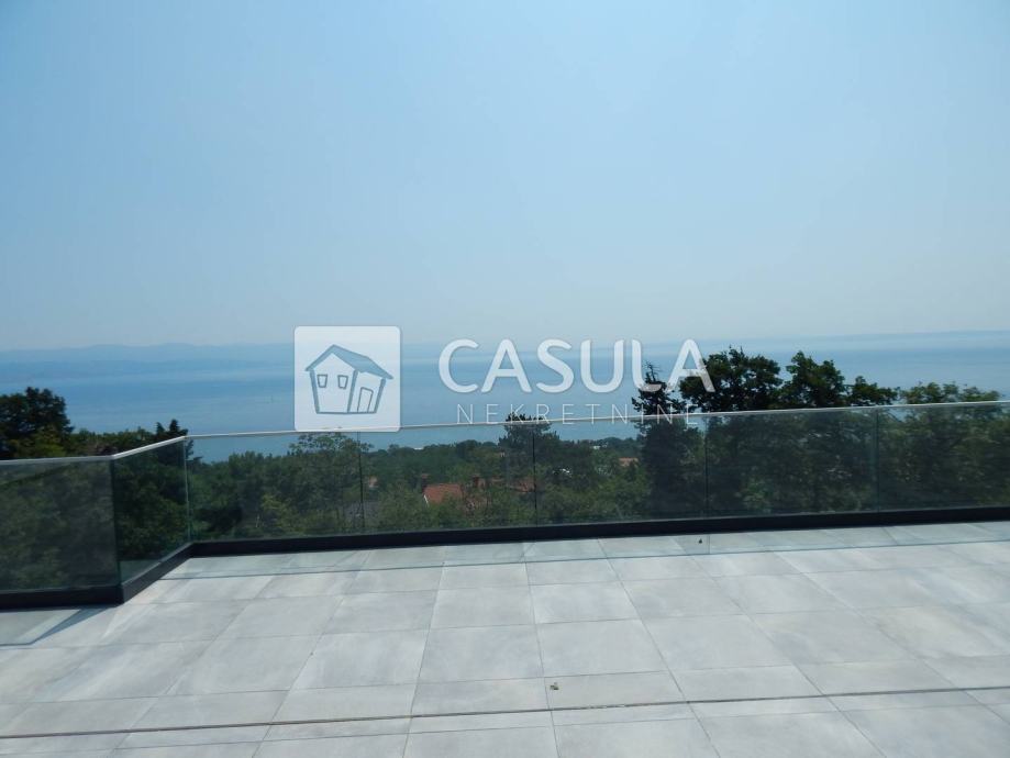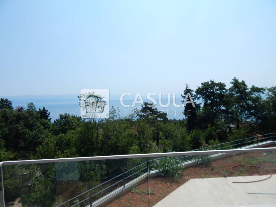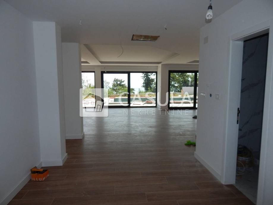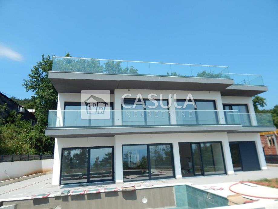 LOVRAN,Vila u završnoj fazi izgradnje. U prizemlju se nalazi garaža površine 36 m2 te s prednje strane kuće veliki otvoreni prostor predviđen za kuhinju, blagovaonu i dnevni boravak iz kojeg se izlazi na natkrivenu terasu i bazen. Na katu je 5 soba, svaka sa svojom kupaonicom. Stepenice vode na ravan krov na kojem je smještena velika terasa (170 m2) na kojoj je predviđen roštilj te jacuzzi. Sa svih katova pruža se prekrasan pogled na more i zelenilo. U izgradnji su korišteni vrhunski materijali, podno grijanje na struju. Dovršetak radova predviđen je do kraja 8 mjeseca 2021.godine.