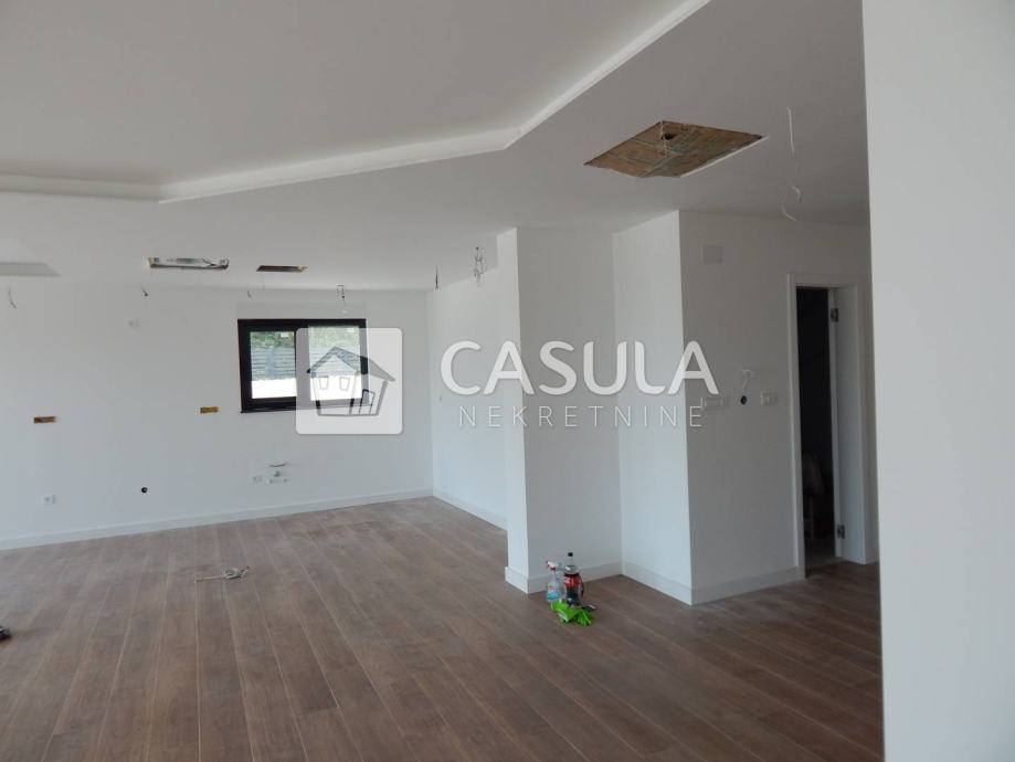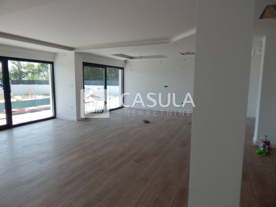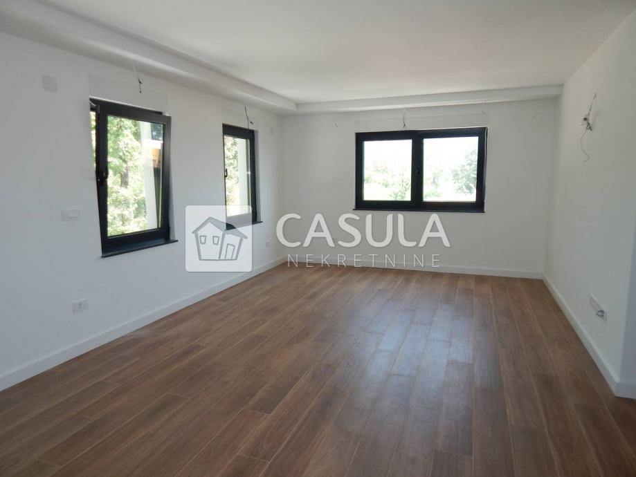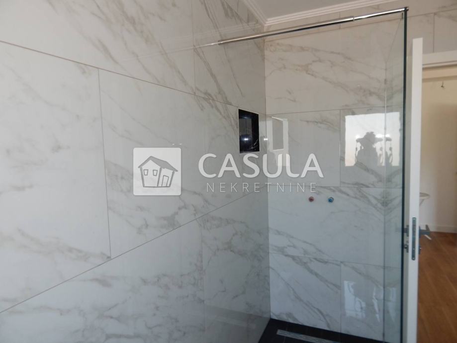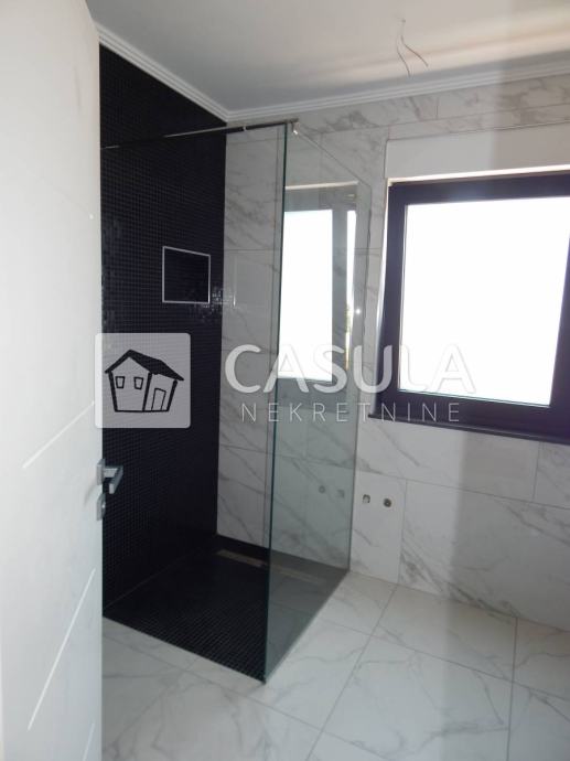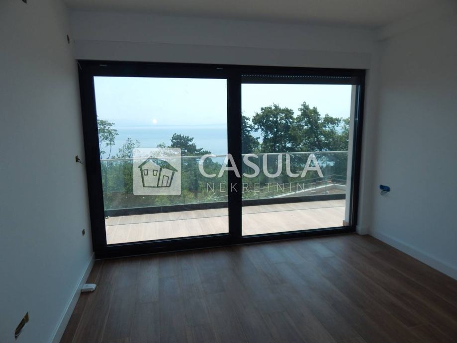 LOVRAN,Vila u završnoj fazi izgradnje. U prizemlju se nalazi garaža površine 36 m2 te s prednje strane kuće veliki otvoreni prostor predviđen za kuhinju, blagovaonu i dnevni boravak iz kojeg se izlazi na natkrivenu terasu i bazen. Na katu je 5 soba, svaka sa svojom kupaonicom. Stepenice vode na ravan krov na kojem je smještena velika terasa (170 m2) na kojoj je predviđen roštilj te jacuzzi. Sa svih katova pruža se prekrasan pogled na more i zelenilo. U izgradnji su korišteni vrhunski materijali, podno grijanje na struju. Dovršetak radova predviđen je do kraja 8 mjeseca 2021.godine.
