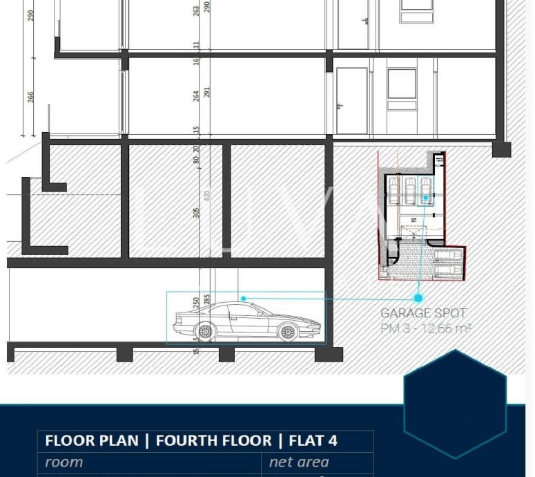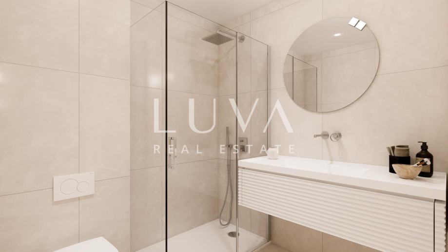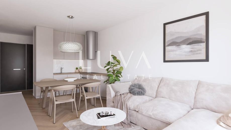 Stan se nalazi na etaži koja je gledajući s ceste 4. kat, a sa stražnje strane je 1. Kat. Stan ima 62 m2 neto, 88,4 m2 bruto, a sastoji se od ulaznog hodnika, 2 spavaće sobe, kupaonice i prostranog dnevnog boravka spojenog s kuhinjom iz kojeg se izlazi na veliku terasu s koje se pruža predivan pogled na more. Stanu pripada garažno parking mjesto.