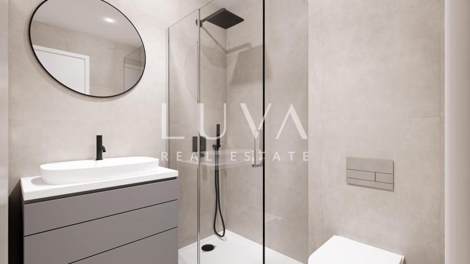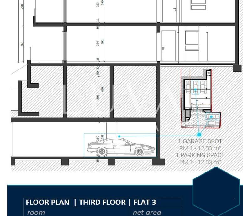 Stan se nalazi na etaži koja je gledajući s ceste 3. kat, a sa stražnje strane je prizemlje. Stan ima 85 m2 neto, 91 m2 bruto, a sastoji se od ulaznog hodnika, 2 spavaće sobe s vlastitim kupaonicama i prostranog dnevnog boravka spojenog s kuhinjom iz kojeg se izlazi na lođu. Stanu pripada garažno parking mjesto i vanjsko parking mjesto.