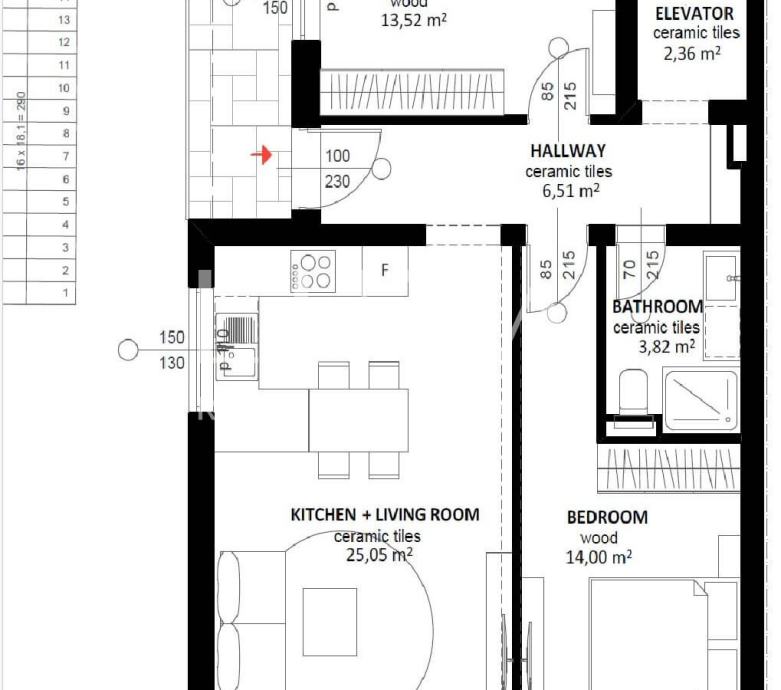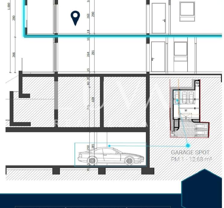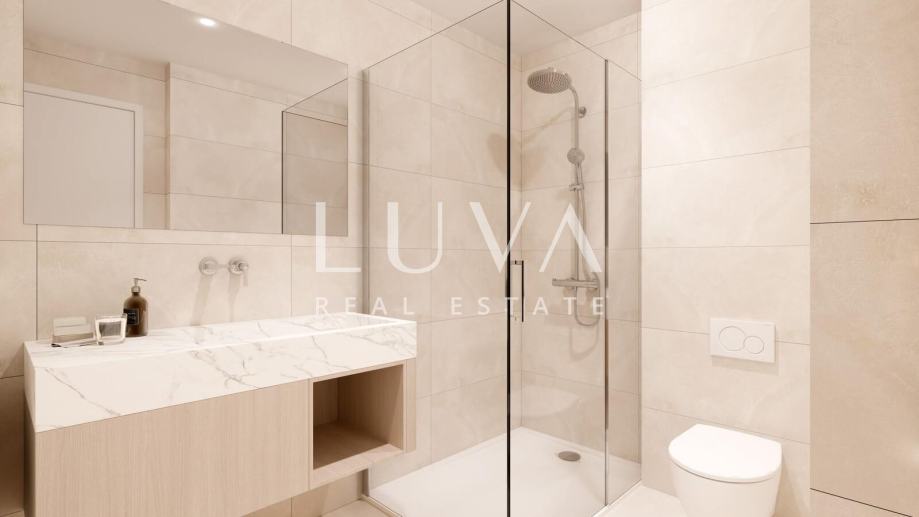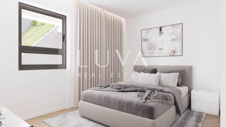 Stan se nalazi na etaži koja je gledajući s ceste 2. kat, a samo sa stražnje strane je ukopana u zemlju. Stan ima 80 m2 neto, 89 m2 bruto, a sastoji se od ulaznog hodnika, 2 spavaće sobe s vlastitim kupaonicama i prostranog dnevnog boravka spojenog s kuhinjom iz kojeg se izlazi na lođu. Stanu pripada garažno parking mjesto.