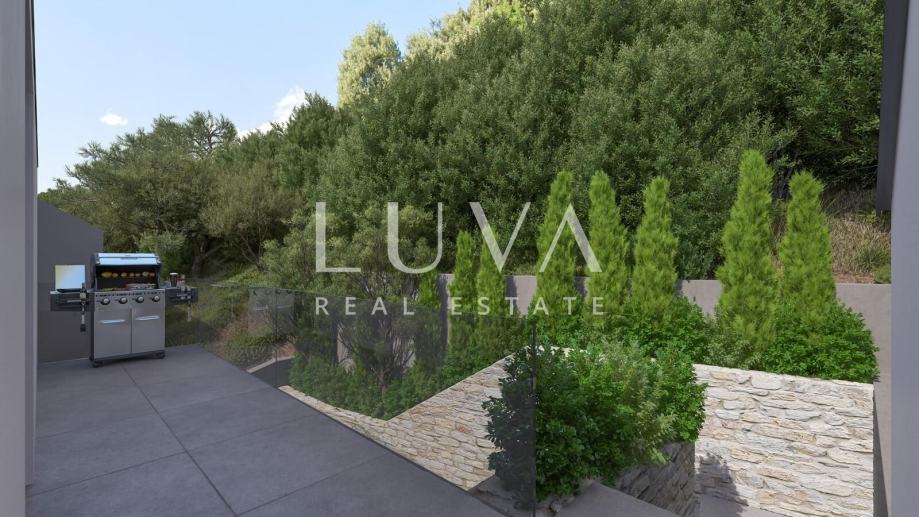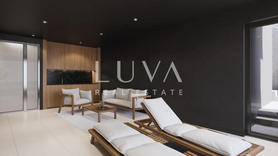 Na prvoj etaži koja je značajno povišena iznad ceste se nalazi vanjski bazen na terasi, wellness prostorija sa saunom i kupaonicom, teretana i praonica.