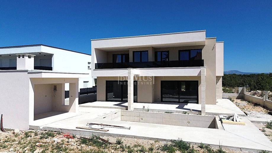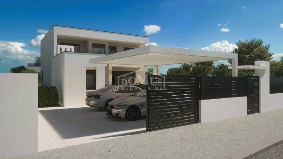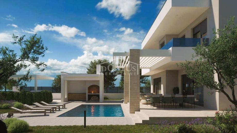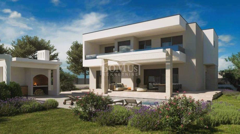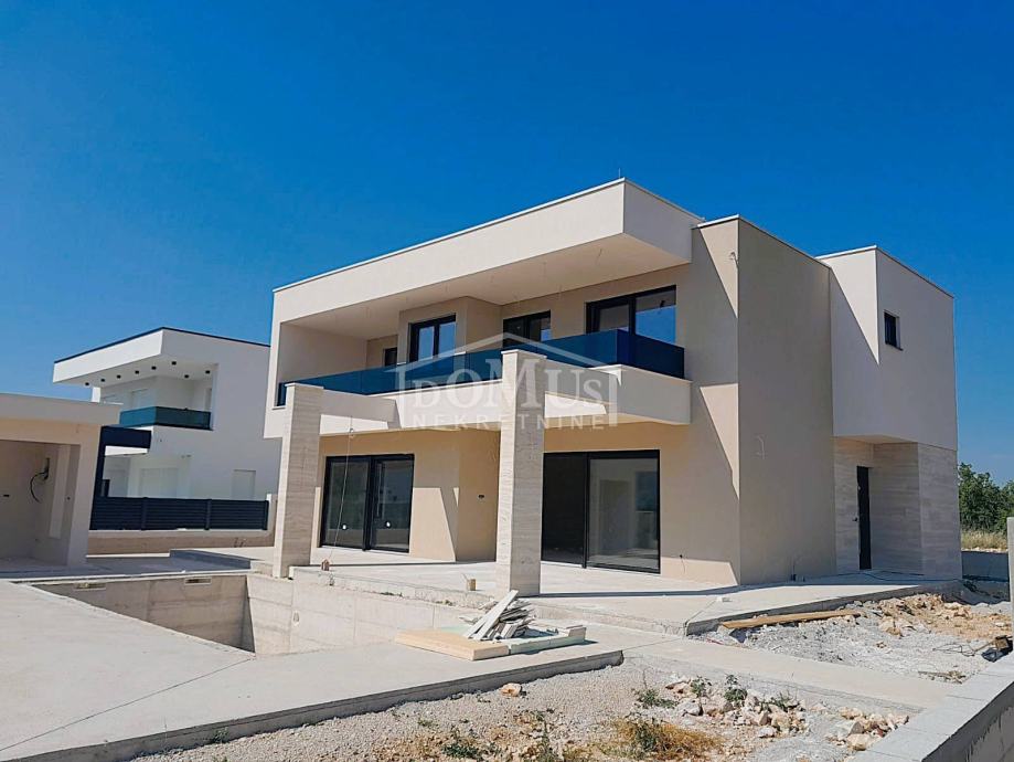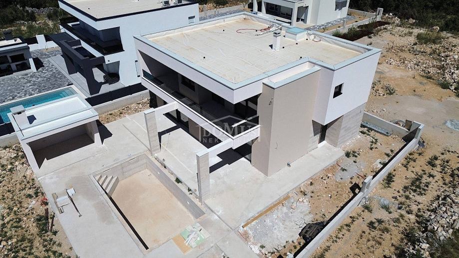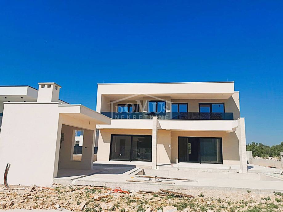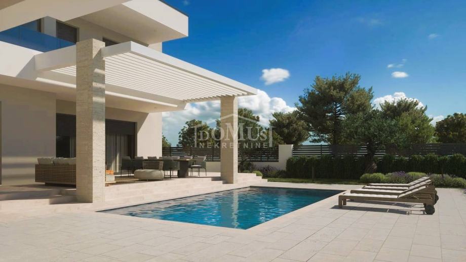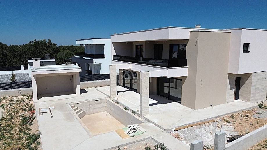 Lozovac, zaleđe Šibenika, udaljen je samo 2,5 km od Nacionalnog parka Krka, a u ponudi je obiteljska kuća moderne arhitekture i funkcionalnog rasporeda s bazenom, ukupne korisne površine 242,28 m², smještena na parceli od 727 m². Kuća se sastoji od hodnika, WC-a, spavaće sobe s vlastitom kupaonicom, kuhinje i blagovaonice te prostranog dnevnog boravka iz kojeg se izlazi na veliku, dijelom natkrivenu terasu od 41,36 m², uz koju se nalazi veliki bazen od 33,22 m² i popločano sunčalište. Na 1. katu nalaze se hodnik, 3 sobe, od kojih jedna ima vlastitu kupaonicu, te zasebna kupaonica i garderoba. Sve tri spavaće sobe imaju izlaz na veliku zajedničku terasu od 24,36 m².