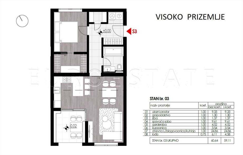 PROSTORIJE STANA: vidjeti priloženi tlocrt (S3) i popis prostorija sa površinama
