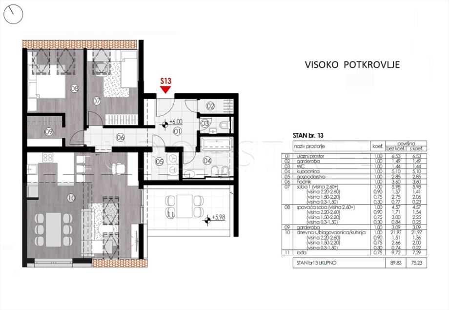 PROSTORIJE STANA: vidjeti priloženi tlocrt (S13) i popis prostorija sa površinama