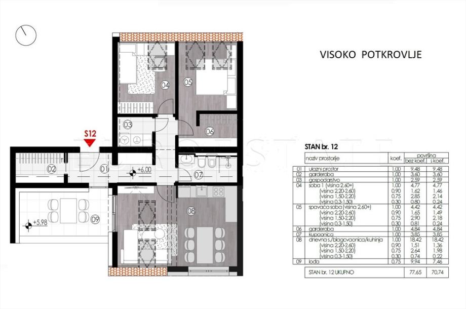 PROSTORIJE STANA: vidjeti priloženi tlocrt (S12) i popis prostorija sa površinama