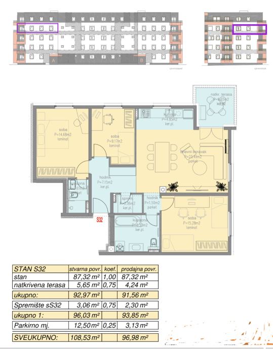 Stan se satoji od: Ulazni hodnik, kupaona+WC, kuhinja+blagovaona+dnevni boravak s izlazom na natkrivenu terasu, spremište, dvije dječje sobe, spavaće sobe i kupaone. Stanu pripadaju spremište i parking mjesto