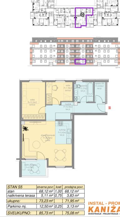 Stan se satoji od: Ulazni hodnik, kupaona+WC, kuhinja+blagovaona+dnevni boravak s izlazom na natkrivenu terasu, spremište, dječje sobe i spavaće sobe. Stanu pripadaju spremište i parking mjesto
