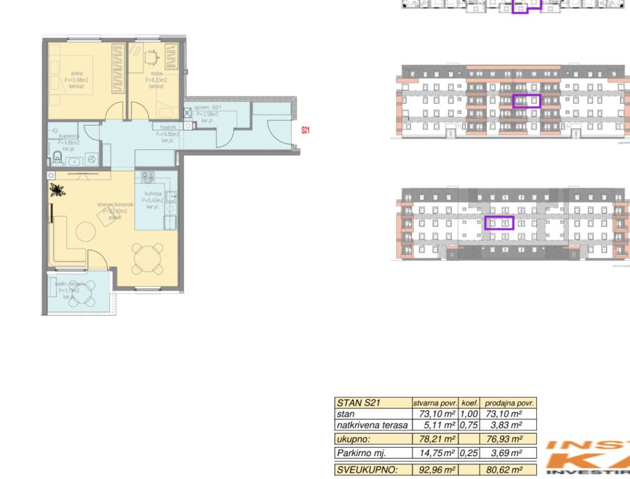 Stan se satoji od: Ulazni hodnik, kupaona+WC, kuhinja+blagovaona+dnevni boravak s izlazom na natkrivenu terasu, dječje sobe i spavaće sobe. Stanu pripadaju spremište i parking mjesto