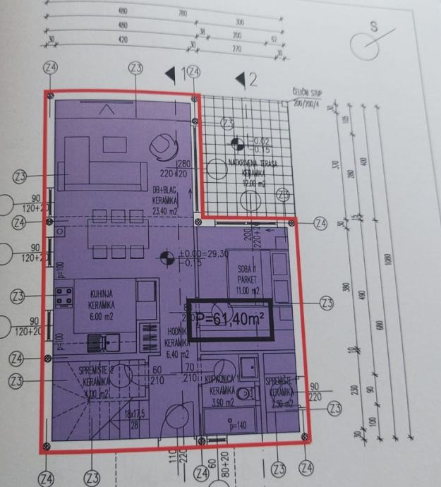 Dnevni boravak i spavaća soba imaju izlaz na natkrivenu terasu u prizemlju površine 12m2.