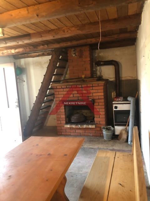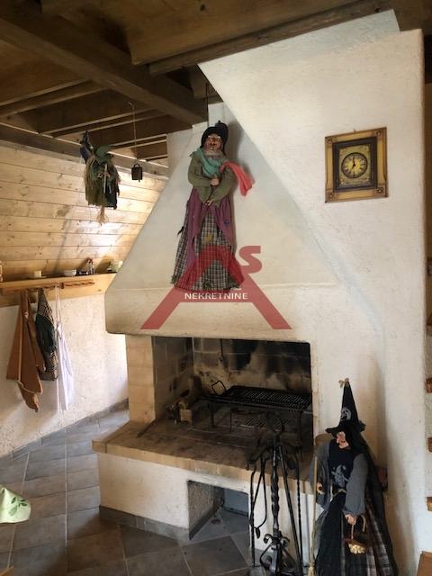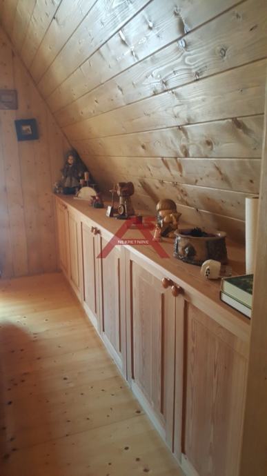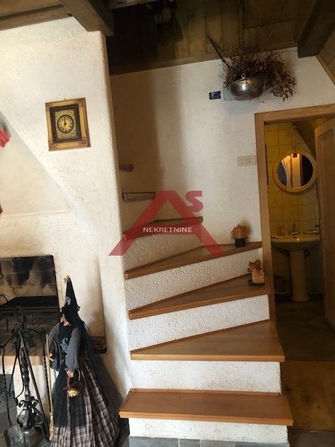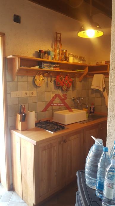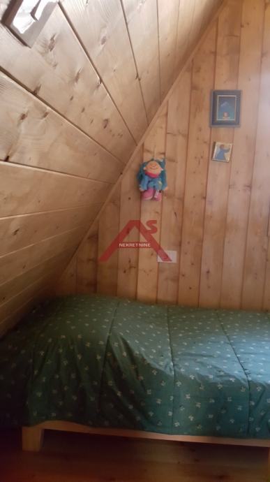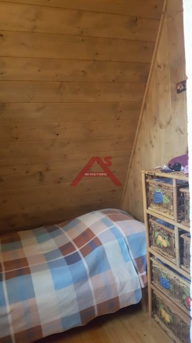 U prizemlju je kuhinja sa izlazom na terasu, kupaona i stubište koje vodi u visoko potkrovlje gdje su dvije spavače sobe.