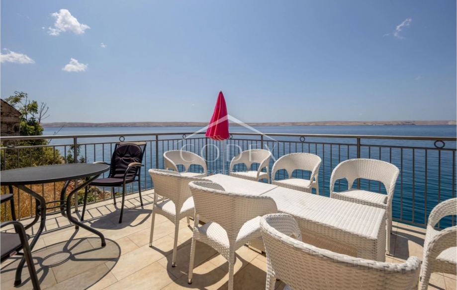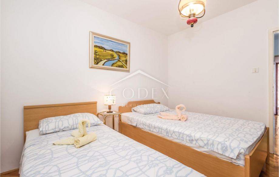 Na katu kuće smjestila se druga stambena jedinica koja nudi tri prostrane spavaće sobe, kupaonicu i drugi, prostran dnevni boravak s kuhinjom. Iz ovog dnevnog boravka izlazi se na balkon s prekrasnim pogledom na more i otoke, idealan za uživanje u zalascima sunca ili jutarnjim sunčanim trenucima. Obje etaže opremljene su klima uređajima, a na katu dodatno postoje kamin i termo peć na struju koji pridonose ugodnoj atmosferi tokom hladnijih mjeseci.