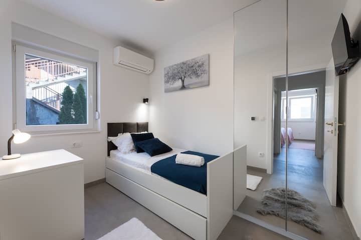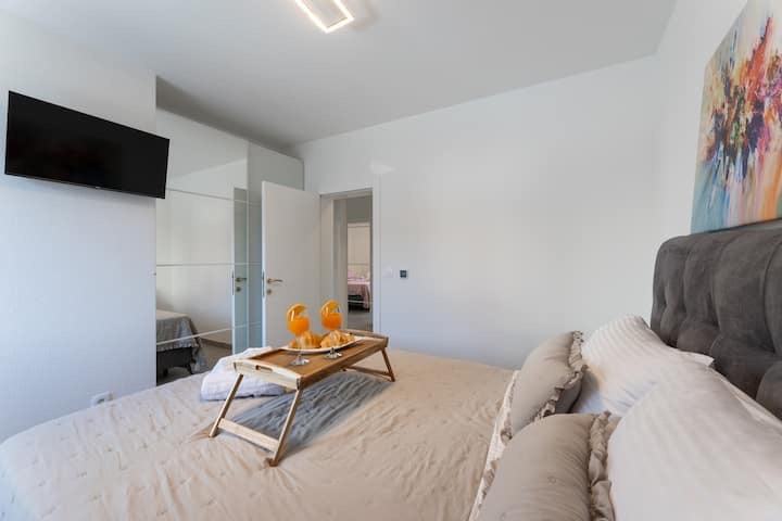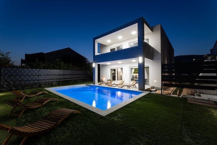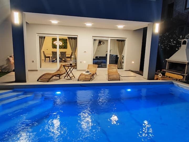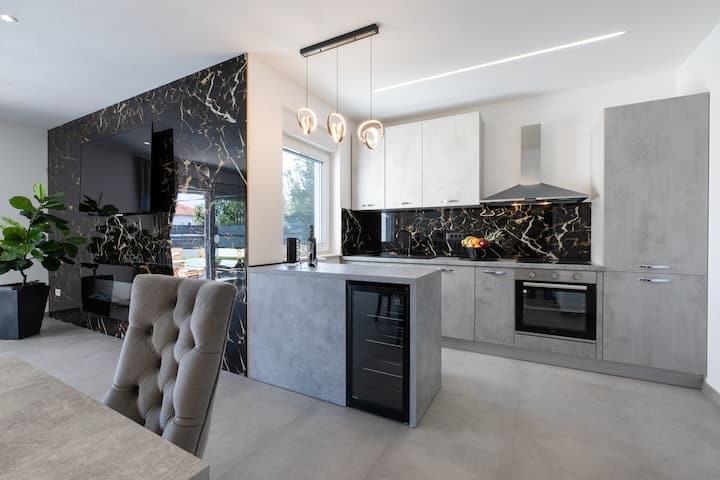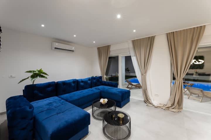 Posredujemo u najmu prekrasne, moderne i luksuzne ville smještene u Kaštel Novom. Villa ima sve što je potrebno za ugodan i miran boravak. Kompletno je opremljena sa svim vrhunskim aparatima i uređajima. Svaka prostorija u villi ima klima uređaj i smart TV - s pristupom na internet. Ima besplatno parkiralište, bazen s ležaljkama za uživanje na otvorenom u ovom mirnom i intimnom okruženju gdje je sama villa i smještena. Sastoji se od tri spavaće sobe, dva kupatila, kuhinje sa blagovaonom, prostranog dnevnog boravka iz kojeg se izlazi na terasu i vanjski dio s bazenom...