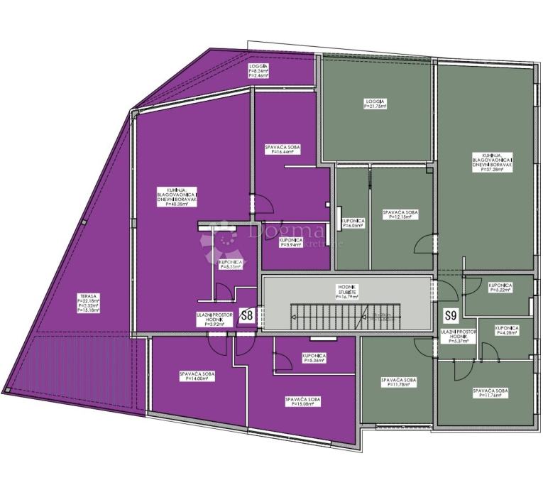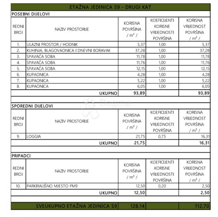 Stan S9 nalazi se na 2. katu zgrade koja se sastoji od ukupno 9 stanova raspoređenih na ukupno 3 etaže. Ukupne neto površine je 112,70m2 dok mu bruto površina iznosi 128,14m2. Jugozapadne je orijentacije.