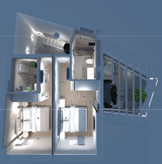 Stan se sastoji od dnevnog boravka sa kuhinjom i blagovaonicom, te kupaonicom na donjoj etaži i dvije spavaće sobe sa kupaonicom na gornjoj etaži.