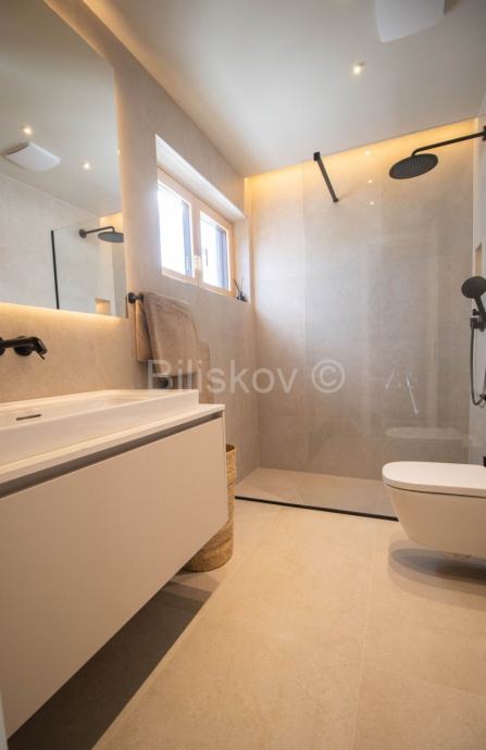 Klimatiziran je Daikin dizalicom topline sve prostorije, postavljeno je podno grijanje, kompletno je opremljen i svi materijali i uređaji koji su u stanu su kvalitete najvišeg nivoa.