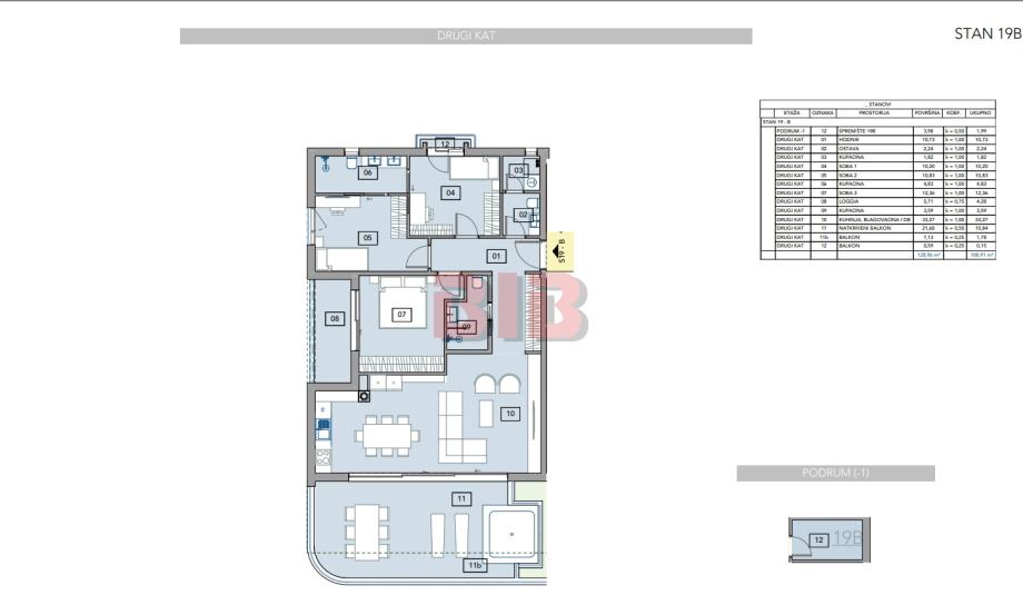 Stan se sastoje od 3 spavaće sobe,dnevnog boravka sa kuhinjom i blagovaonicom,3 kupaonice,,spremišta,hodnika,ostave,lođe,3 balkona od kojih je jedan natkriven(površine 10,84m2).