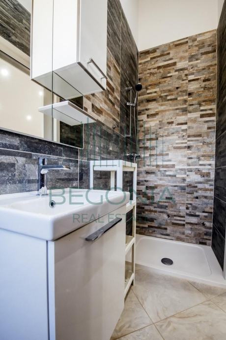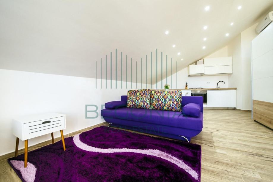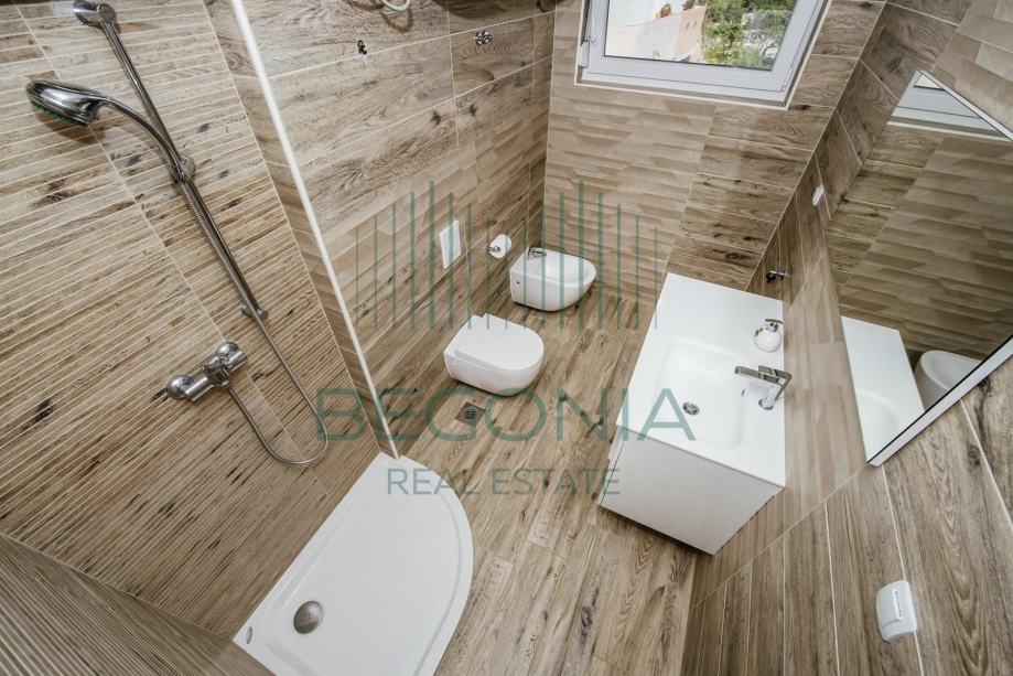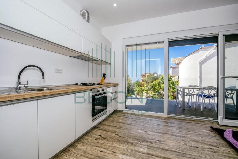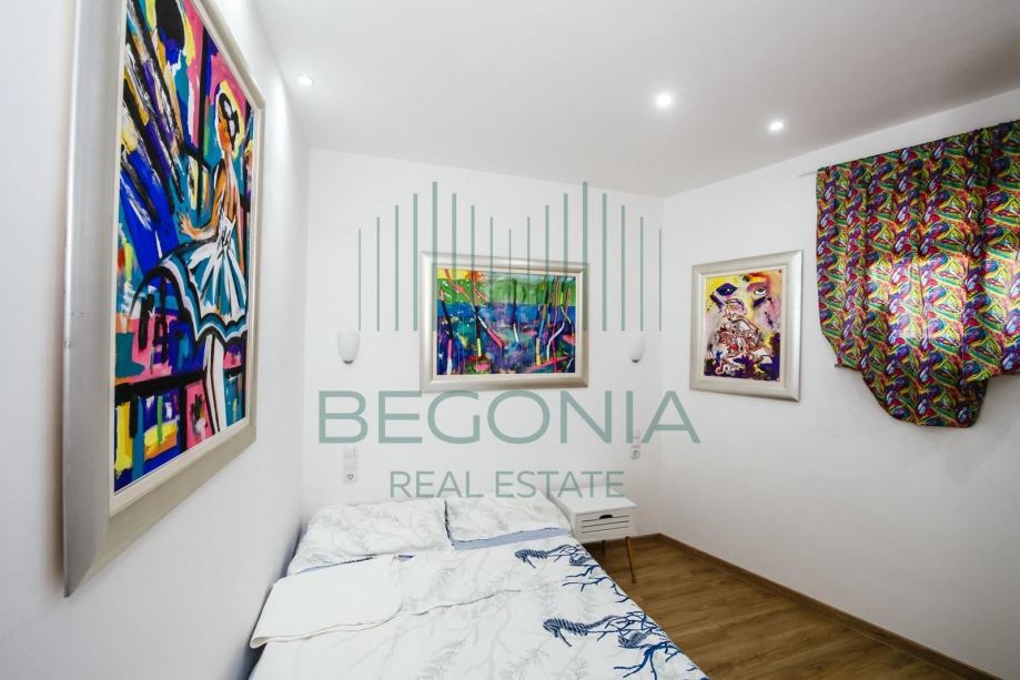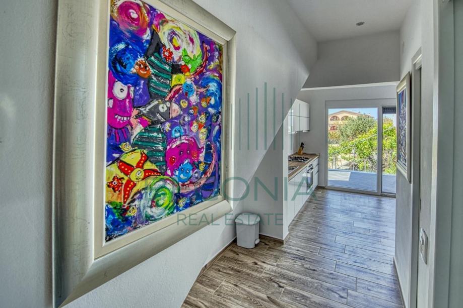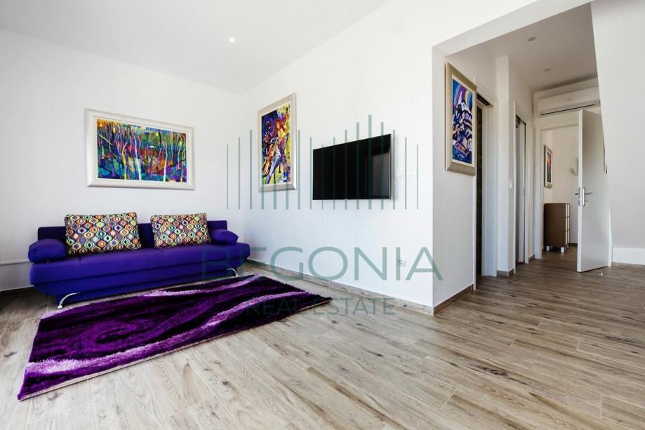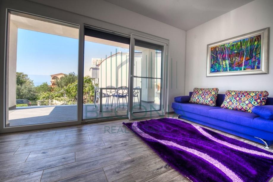 Prodaje se moderno namješten dvoetažni apartman 93 m2, na mirnoj i tihoj lokaciji s pogledom na more. Stan je trenutno pretvoren u dva manja jednosobna apartmana, od kojih svaki ima svoj balkon i pogled na more. Grijanje je izvedeno klima jedinicama.