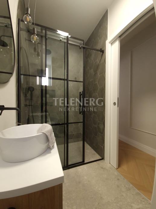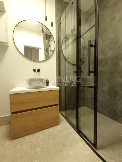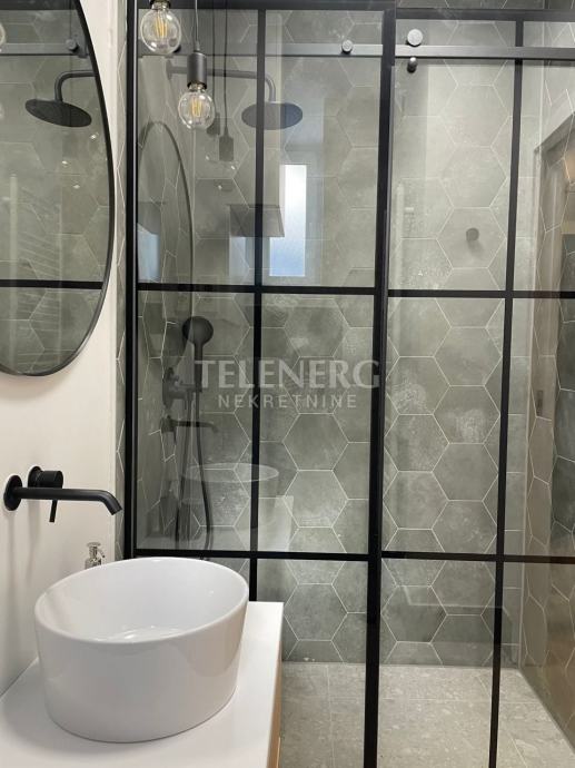 Spektakularna dizajnerska kupaonica s velikim tušem, balkon popločan s novom ogradom.