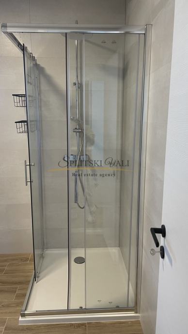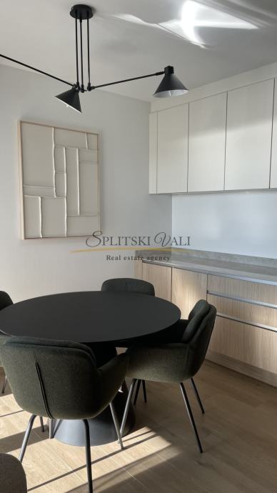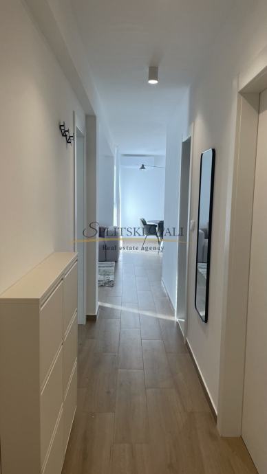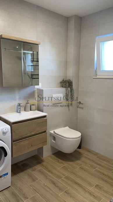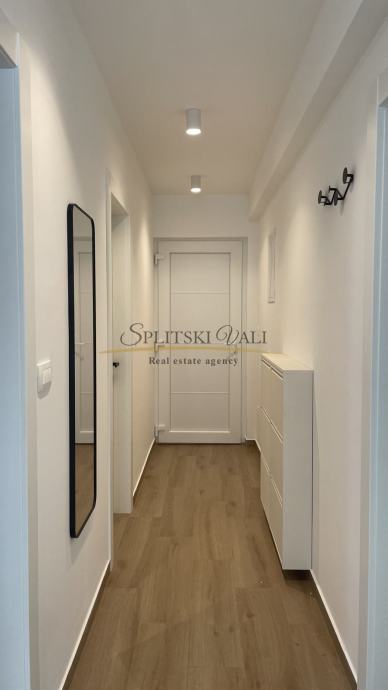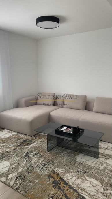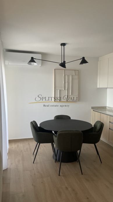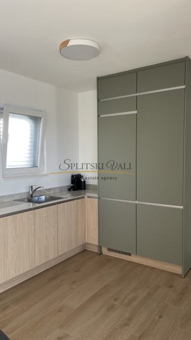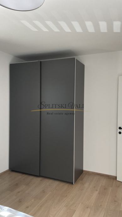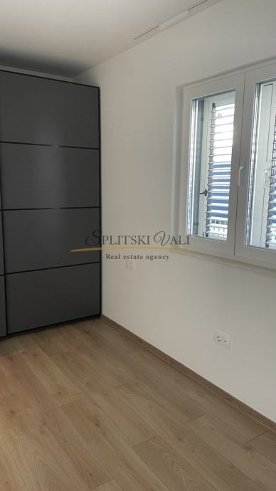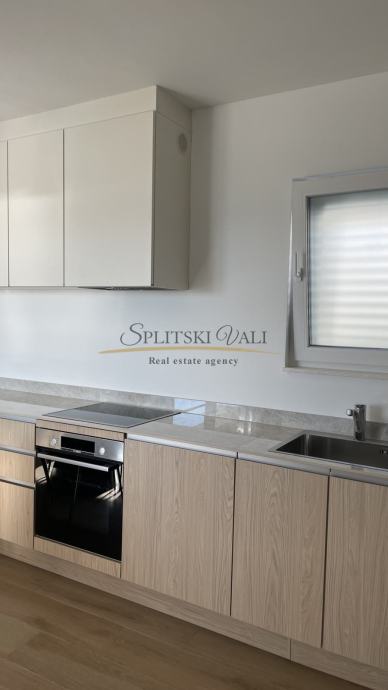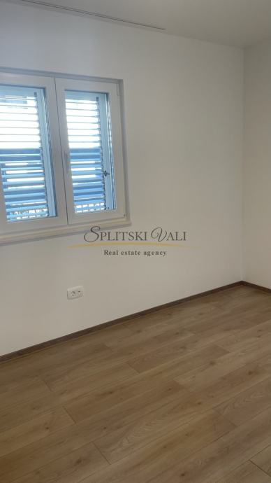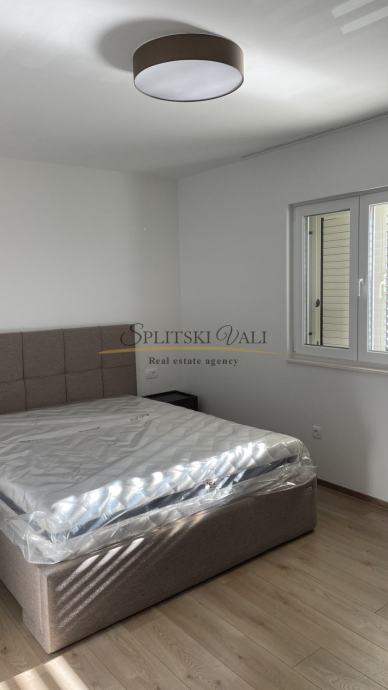 Iznajmljuje se dugoročno (minimalno godinu dana) u novogradnji prekrasan dvosoban stan (66m2 sa balkonom 77m2) u Kaštel Sućurcu sa balkonom, pogledom na more i osiguranim vanjskim parkirnim mjestom. Prvo useljenje. Mirno okruženje, novia manja zgrada poviše brze ceste. Nalazi se na 1. katu manje zgrade sa 4 stana. Okrenut prema jugu i osunčan. Opremljen velikom kvalitetnom kuhinjom po mjeri Nobilia sa keramickom pločom (4.7 mx 2.3 m), Bosch aparatima, Kave home, Kartell namjestaj, klima uređaj.