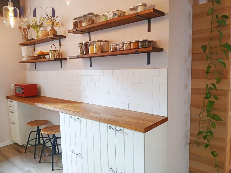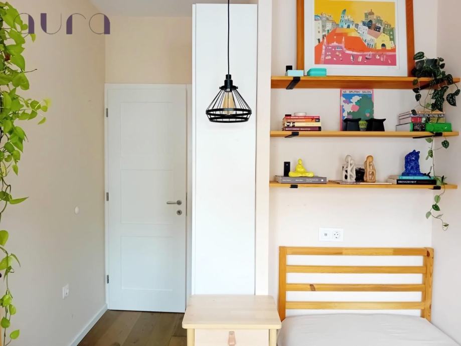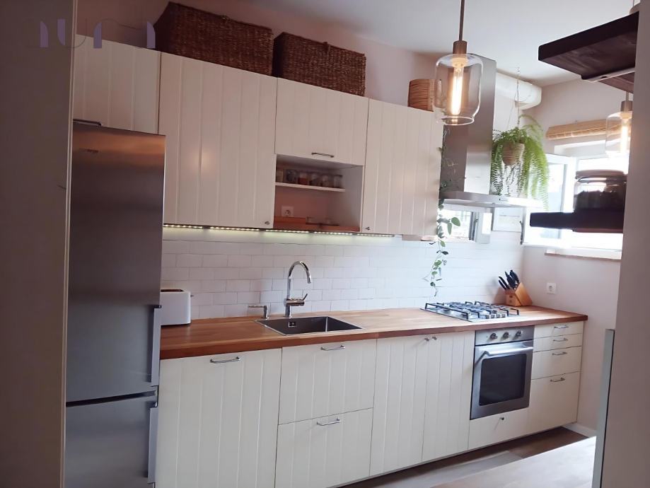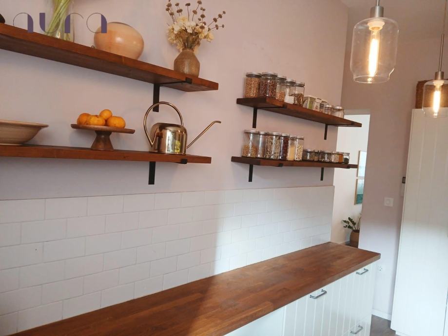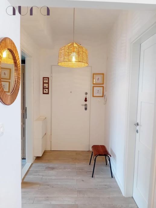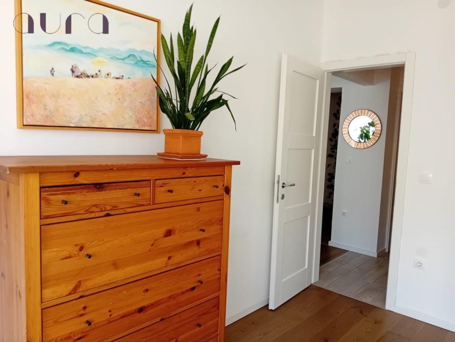 Stan se sastoji od dvije prostrane i svijetle spavaće sobe, koje spajaju duh starinskog šarma i moderan dizajn. U njima vlada mir, udobnost i osjećaj doma. Hodnik je elegantno uređen i vodi prema prekrasnoj kuhinji – moderno opremljenoj svim suvremenim aparatima, s malim šankom i barskim stolicama koji pozivaju na jutarnju kavu i razgovor.