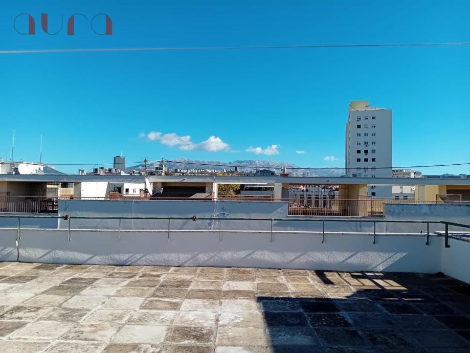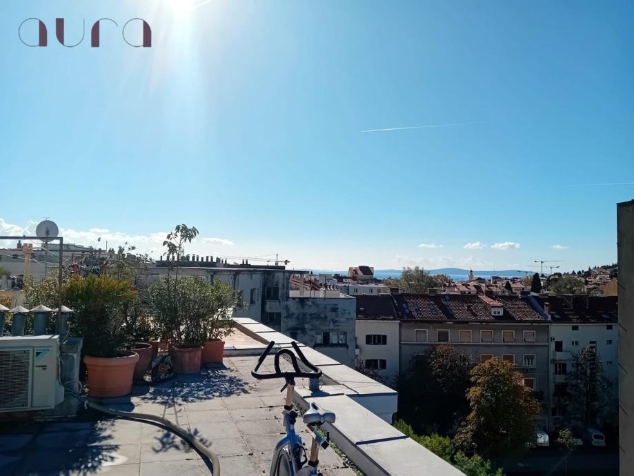 Posebna čar ovog stana je prostrana terasa na krovu zgrade, s koje se pruža očaravajući pogled na more i grad koji diše životom. To je mjesto za jutarnje kave, zalaske sunca i tihe večeri pod zvjezdanim nebom.