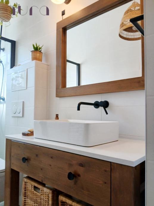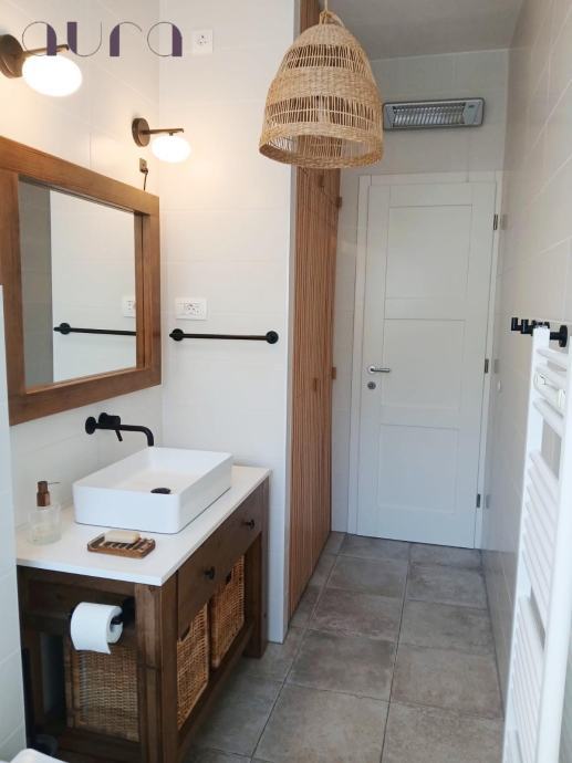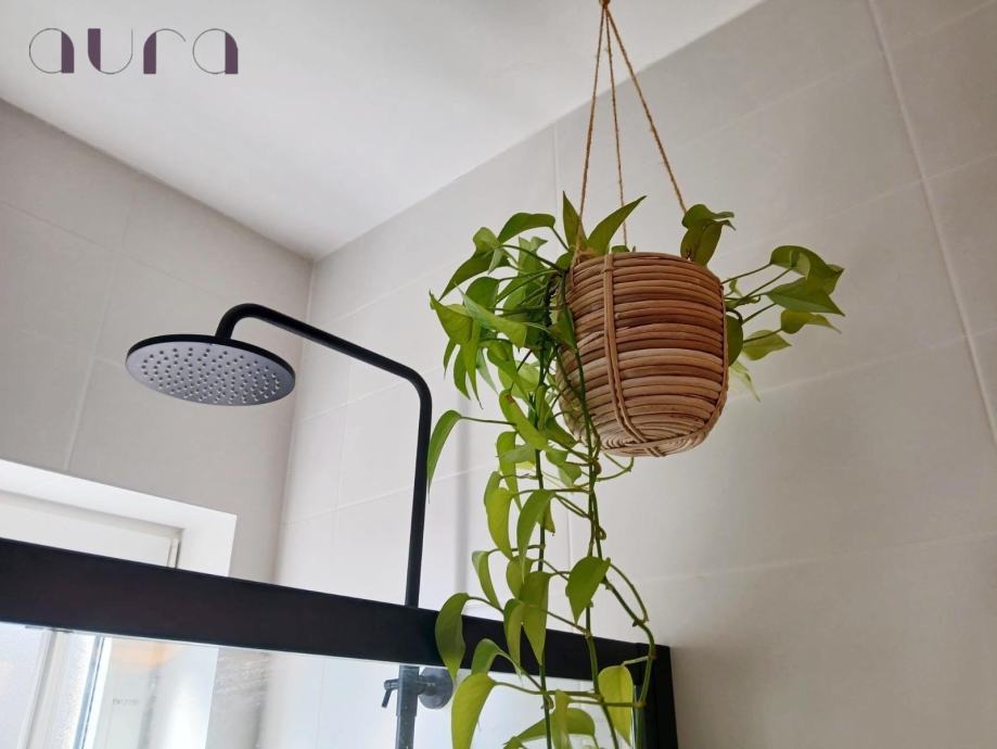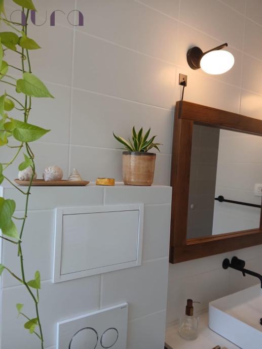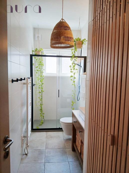 Stan sadrži i prostranu i elegantnu kupaonicu, modernog dizajna, s vrhunskim sanitarijama i kvalitetnim keramičkim oblogama. Kupaonica je funkcionalna i istovremeno estetski privlačna, pružajući osjećaj luksuza i privatnosti. Svjetlost koja dolazi kroz prozor dodatno naglašava prozračnost prostora.