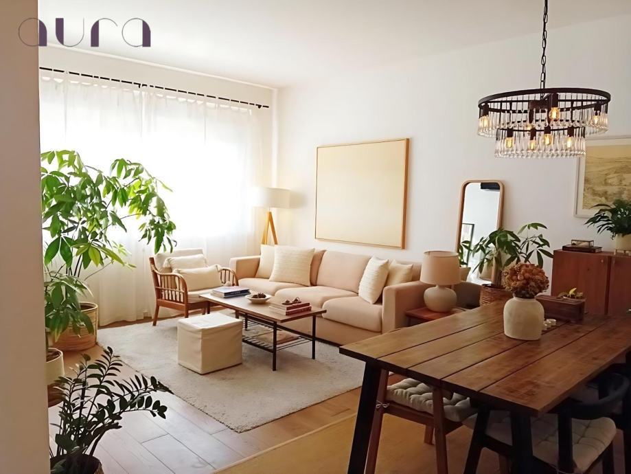 Dnevni boravak odiše svjetlom i toplinom, ukrašen zelenilom biljaka koje unose dašak prirode u sam stan. Prostor je otvoren prema blagovaonici, stvarajući skladnu cjelinu idealnu za druženje, opuštanje i stvaranje uspomena.