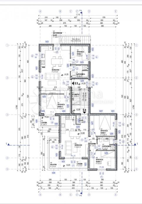 Unutrašnjost stana se sastoji od prostranog open space prostora kuhinje, blagavaonice i dnevnog boravka (21,84m2), spavaće sobe 1 (6,37m2), spavaće sobe 2 (11,38m2), kupaonice (3,87m2) te natkrivene loggie (1,89m2).