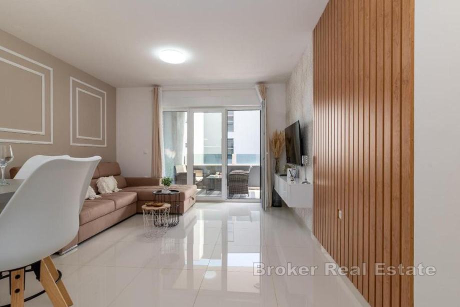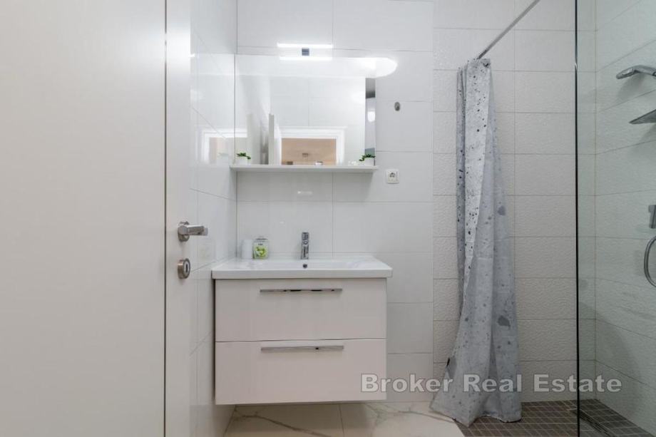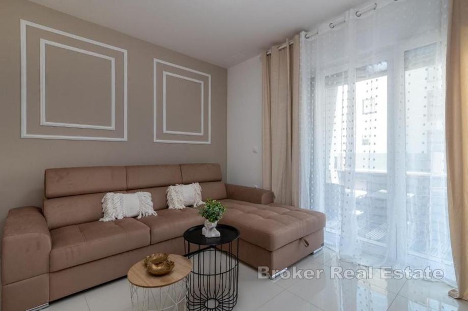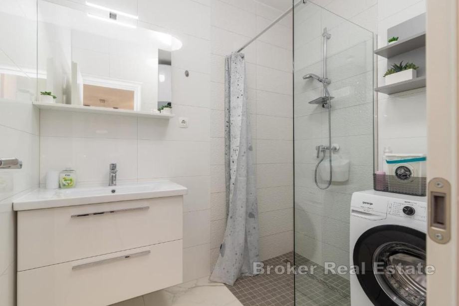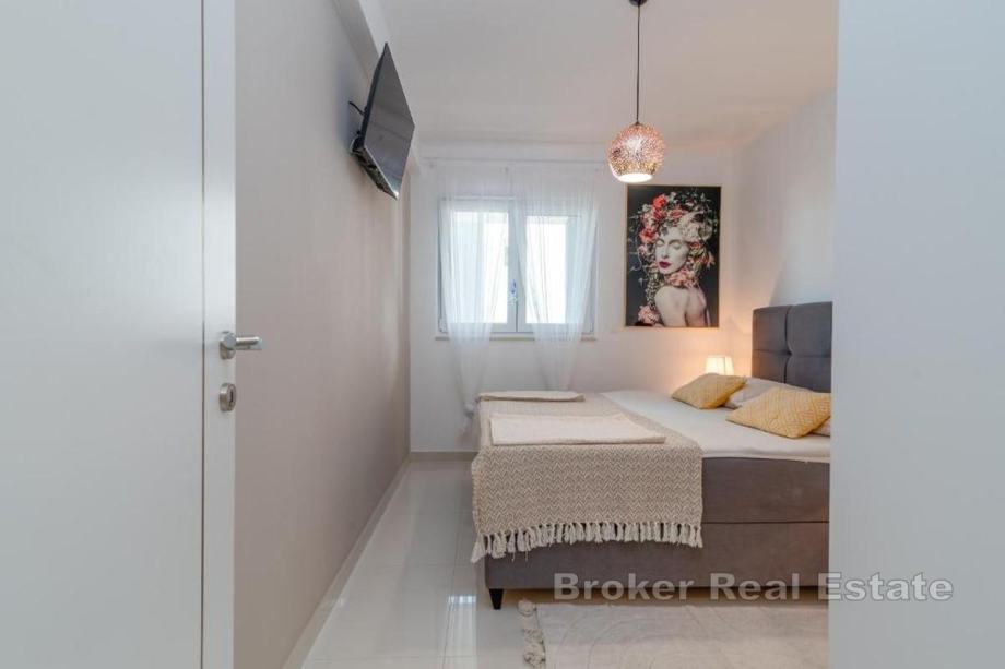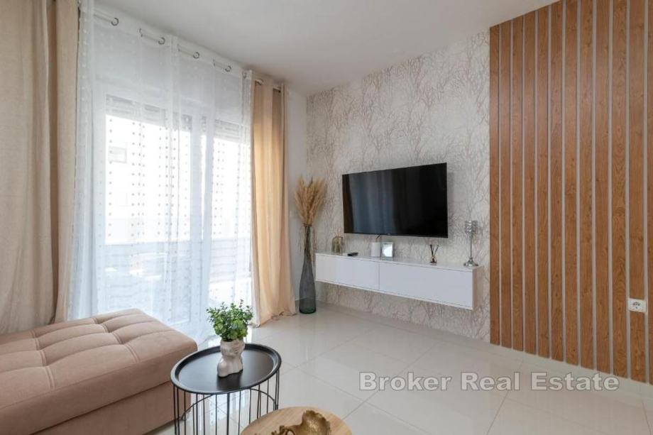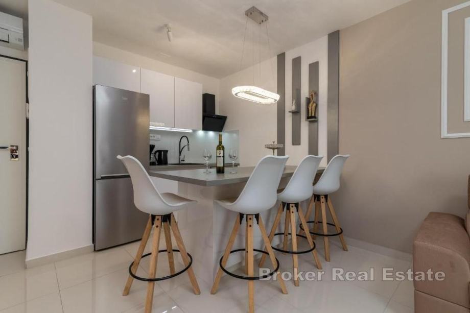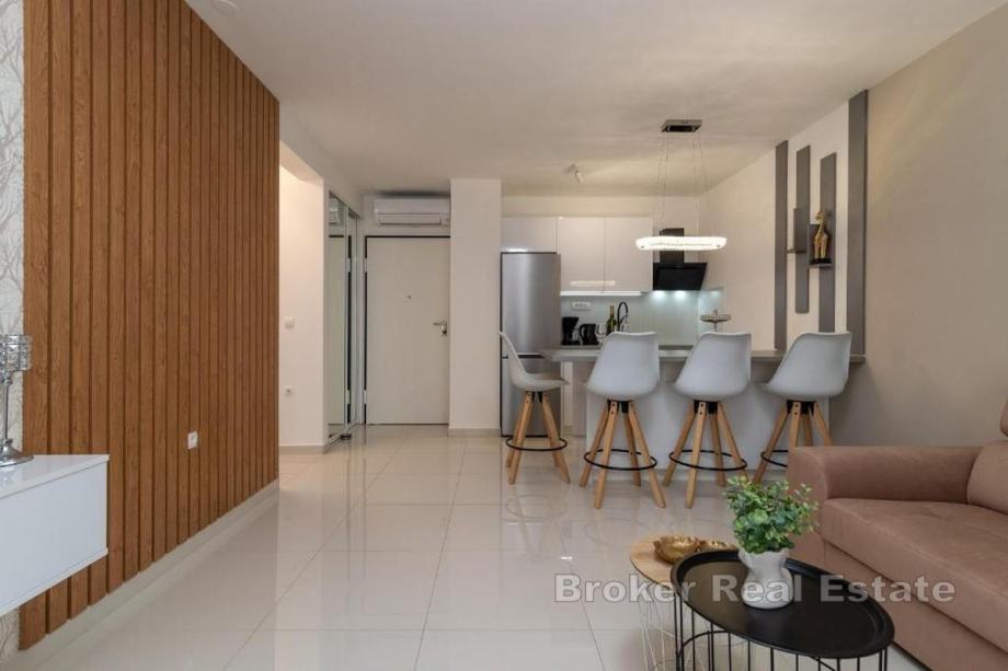Ukupna površina stana iznosi 39,20 m², a sastoji se od funkcionalno raspoređenih prostorija: ulaznog prostora i hodnika, prostrane spavaće sobe, moderno uređene kupaonice, te otvorenog koncepta kuhinje, blagovaonice i dnevnog boravka. Iz dnevnog prostora izlazi se na prostranu lođu veličine 9,60 m² s djelomičnim pogledom na more. Jedna od najvećih prednosti ove nekretnine je zajednički bazen unutar kompleksa, koji budućim vlasnicima ili gostima nudi dodatni sadržaj za uživanje i odmor. Upravo zbog toga, stan predstavlja izvrsnu priliku za investiciju – idealan je kako za dugoročno stanovanje, tako i za turističko iznajmljivanje.