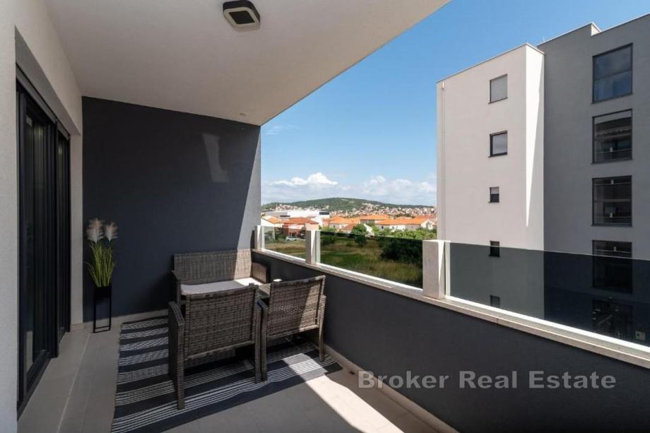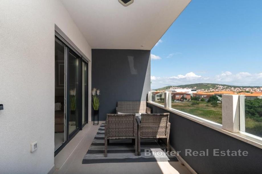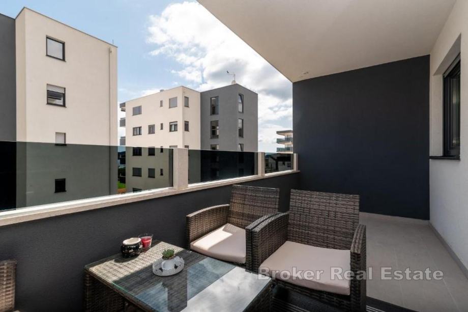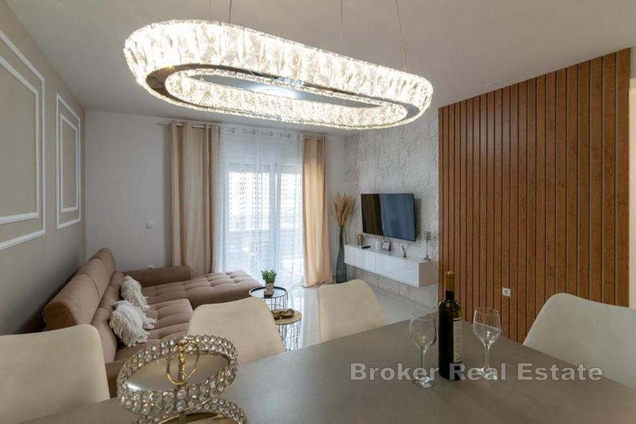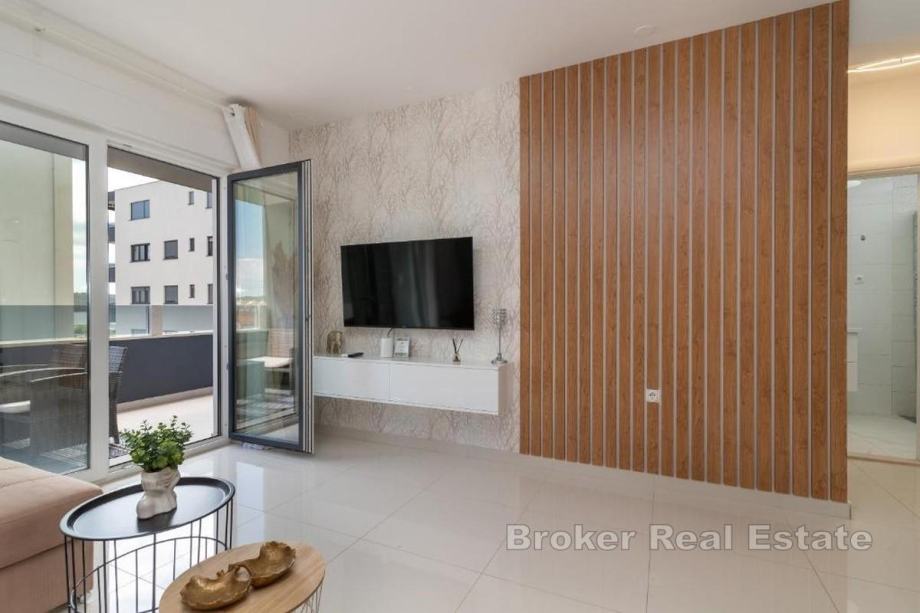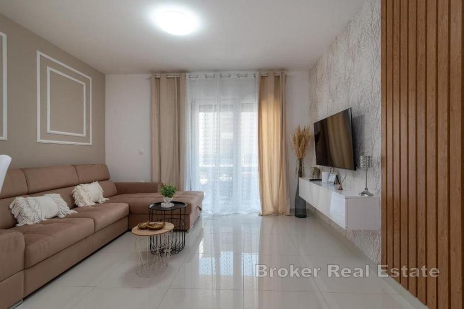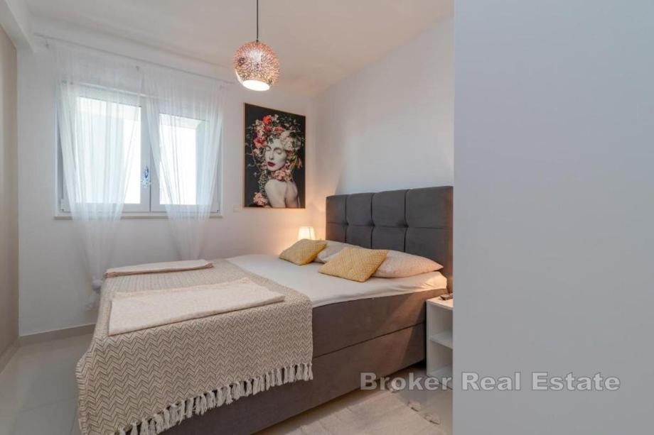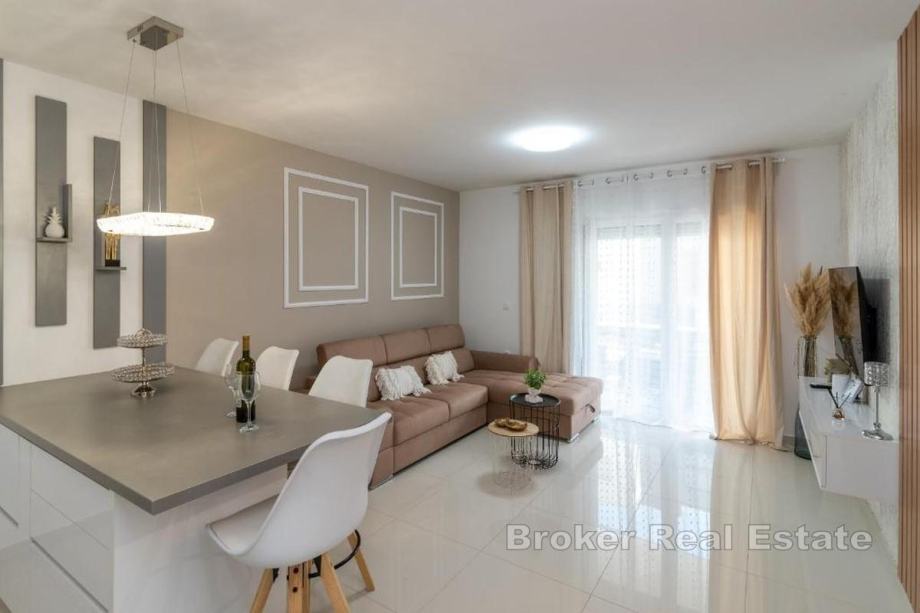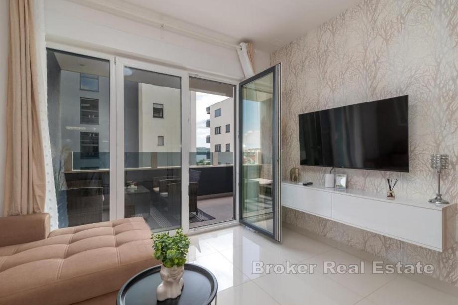 Ukupna površina stana iznosi 39,20 m², a sastoji se od funkcionalno raspoređenih prostorija: ulaznog prostora i hodnika, prostrane spavaće sobe, moderno uređene kupaonice, te otvorenog koncepta kuhinje, blagovaonice i dnevnog boravka. Iz dnevnog prostora izlazi se na prostranu lođu veličine 9,60 m² s djelomičnim pogledom na more. Jedna od najvećih prednosti ove nekretnine je zajednički bazen unutar kompleksa, koji budućim vlasnicima ili gostima nudi dodatni sadržaj za uživanje i odmor. Upravo zbog toga, stan predstavlja izvrsnu priliku za investiciju – idealan je kako za dugoročno stanovanje, tako i za turističko iznajmljivanje.