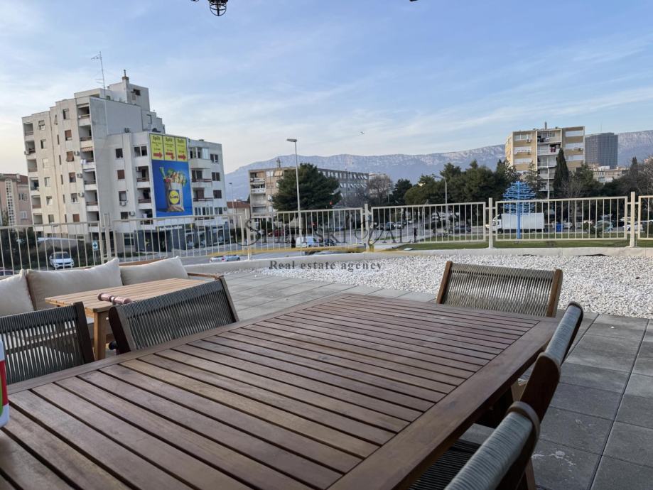 Stan je položen na prvoj etaži stambene zgrade, a prostire se na 93 m2 netto stambene površine. Osim tri spavaće sobe, stan se sastoji od dvije kupaonice, velikog dnevnog boravka s kuhinjom i blagavaonicom, balkona i velike terase od 100m2 s atraktivnim pogledom.