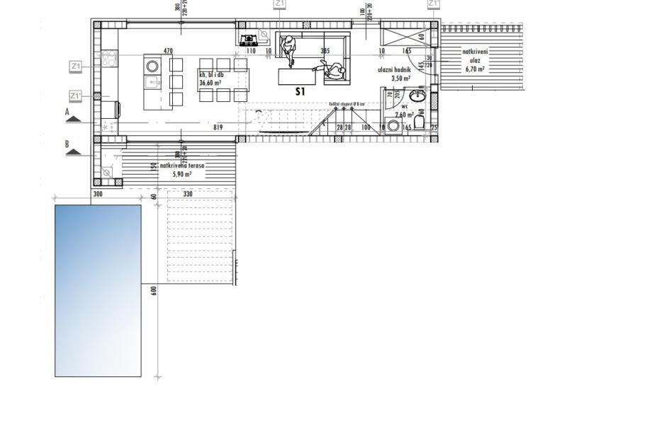 Dimenzije bazena 6x3, strojarnica 3x2 sistem elektrolize, postavljena priprema za grijanje.