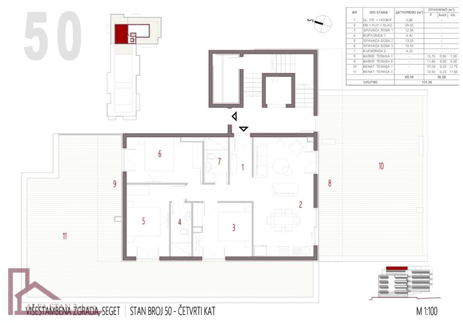 Posebnu vrijednost ovom stanu daju prostrane terase koje ukupno nude više od 145 m2 vanjskog prostora:
