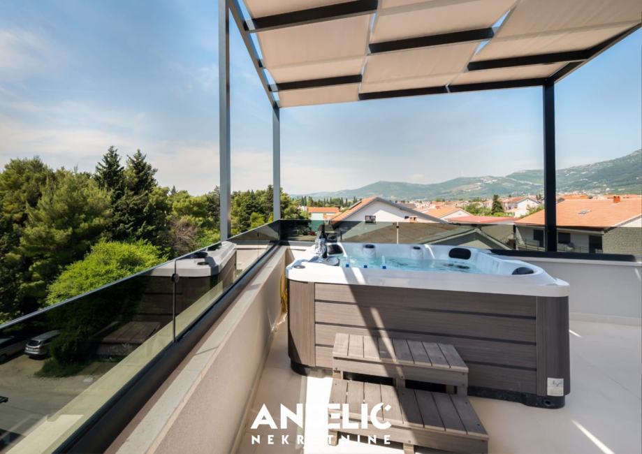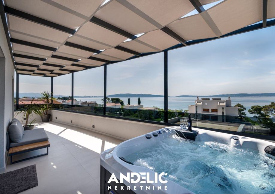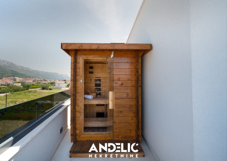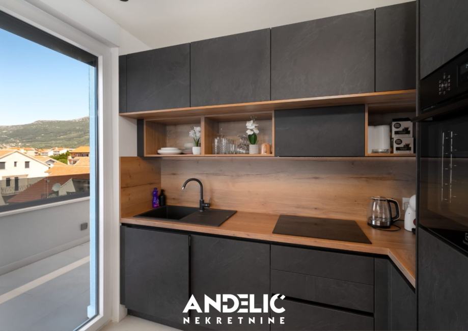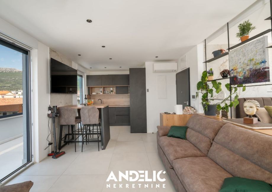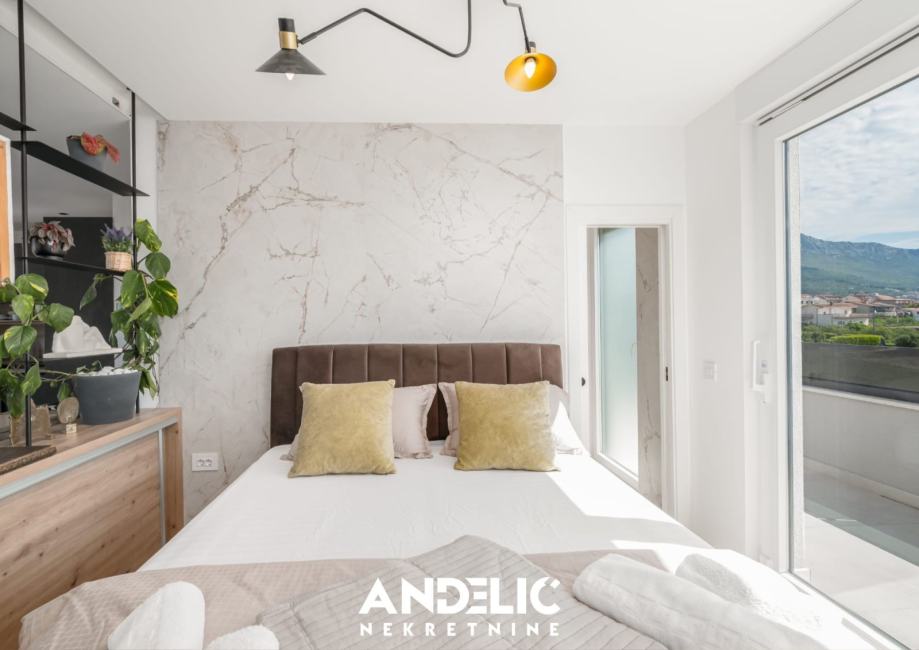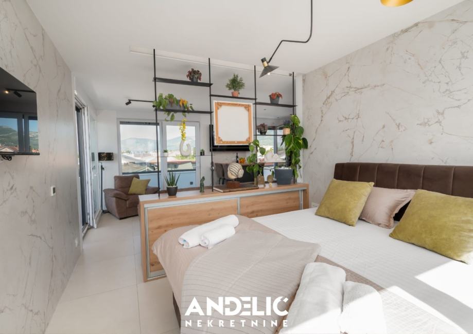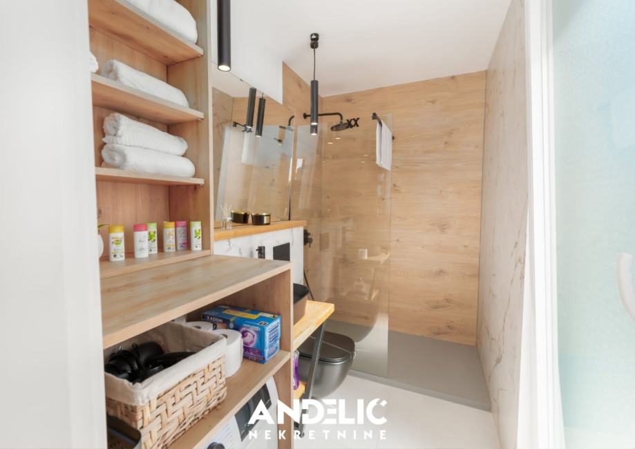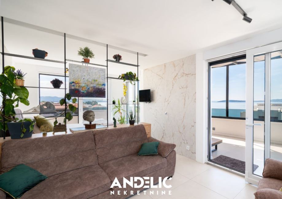 Luksuzan stan u novogradnji sastoji se od jedne spavaće sobe, kuhinje sa blagovaonicom i dnevnog boravka, kupaonice, predprostora, ukupne unutarnje površine od 36 M2. Stan se nalazi na 3 katu novoigrađene zgrade, koji je ujedno i zadnji kat. Stan ima nenatkrivenu terasu od 107 M2, ozelenjeni vrt od 74 M2, dva unutarnja garažna mjesta svako po 11 M2, te dva vanjska parking mjesta, sveukupne površine 250 M2.Smješten je na izvrsnoj lokacji, u blizine predivne plaže, ugostiteljskih lokala i svih potrebnih sadržaja.
