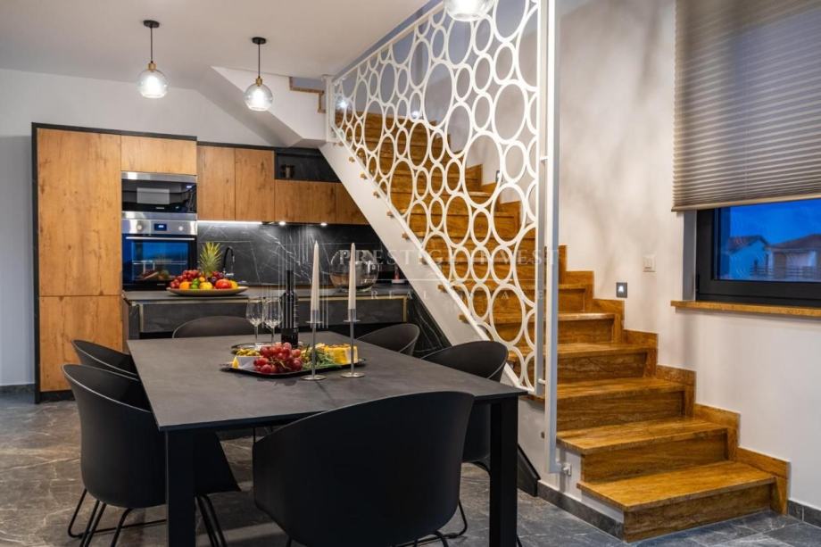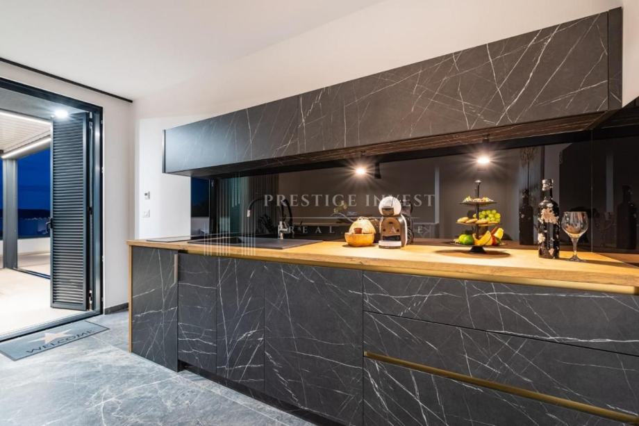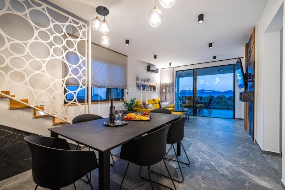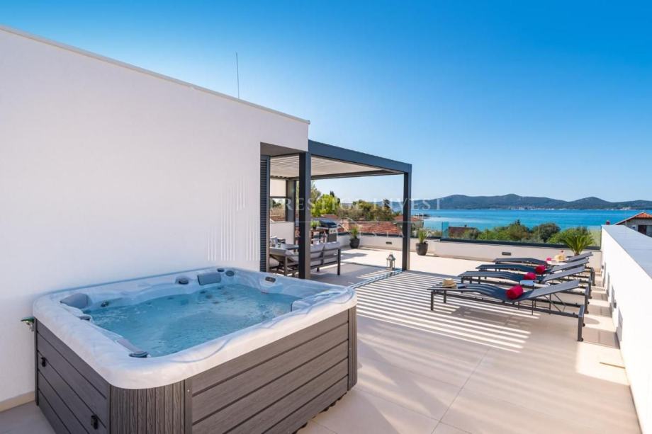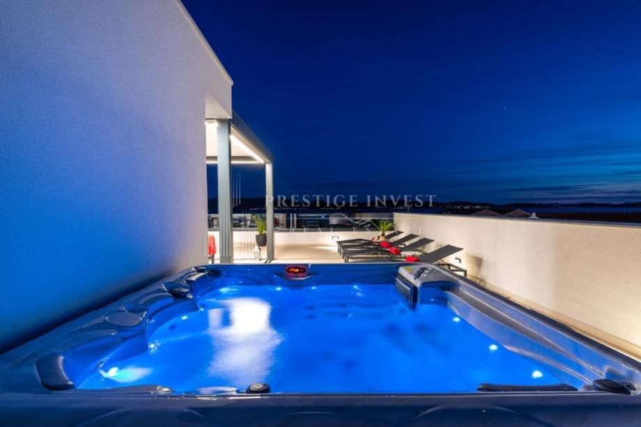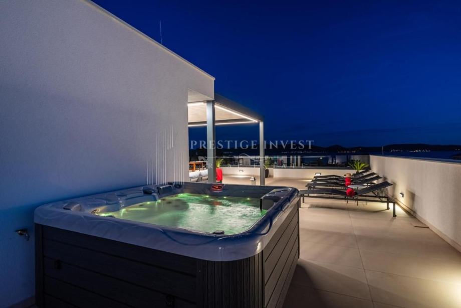 Tlocrt: predulaz, kuhinja, blagovaonica, dnevni boravak, 3 spavaće sobe, 2 kupaonice, WC, 2 hodnika, lođa, natkriveni balkon, krovna terasa ostakljena s bioklimatskom pergolom, unutarnje stepenice koje vode na krovnu terasu na kojoj se nalazi dodatna i opremljena kuhinja s roštiljem, vanjski tuš s ležaljkama i jacuzzi za 5 osoba.