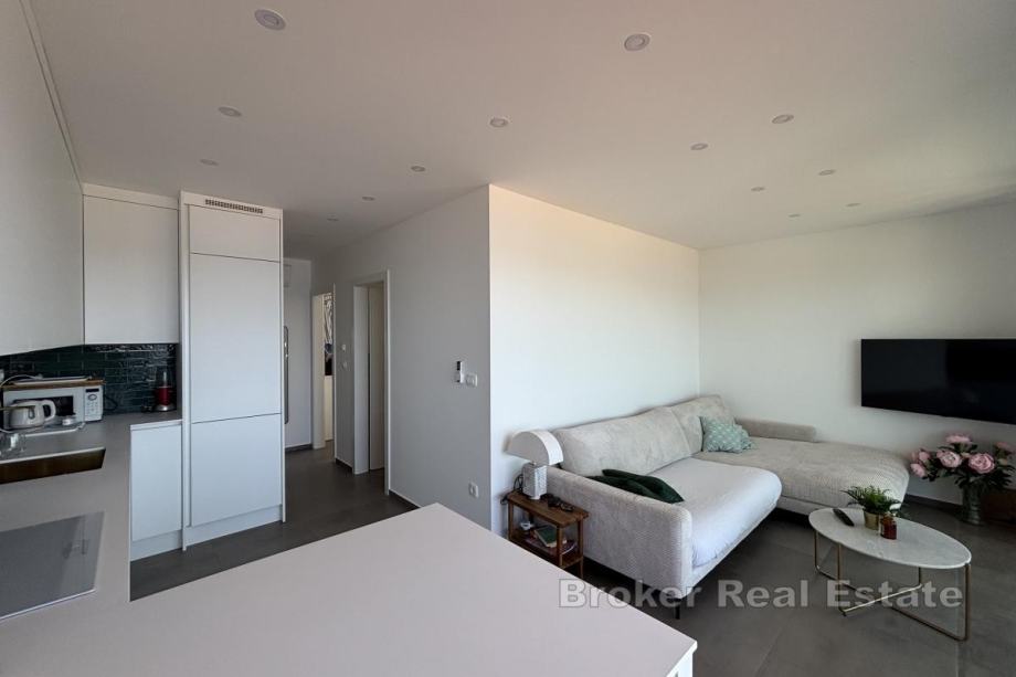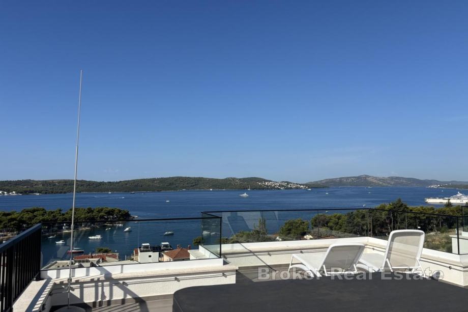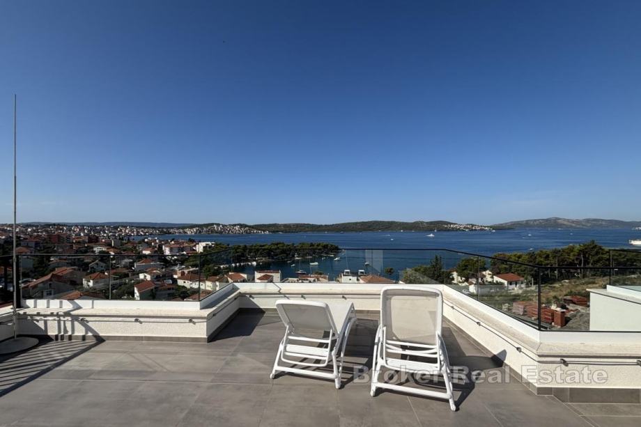 Novoizgrađeni luksuzni penthouse u Trogiru na otoku Čiovu, s pogledom na more i krovnom terasom. Nalazi se na drugom katu manje moderne stambene zgrade i smješten je na mirnoj lokaciji s otvorenim panoramskim pogledom na more. Ova iznimna nekretnina nudi savršen spoj suvremenog dizajna, udobnosti i atraktivne mediteranske okoline, što ju čini idealnim izborom za one koji traže ekskluzivno mjesto za odmor ili investiranje.