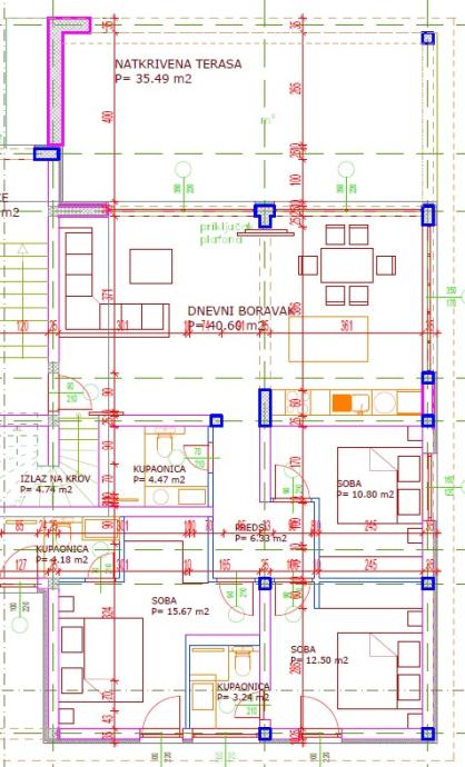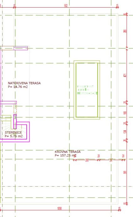 The interior space of the apartment is 102.53m2 with a covered terrace of an additional 35.49m2 and a roof terrace with an uncovered part of 157.25m2 and a covered part of 14.76m2. On the roof terrace there is a summer kitchen and a whirlpool (Wellis). It also has one parking space with an area of 12.84 m2. The total usable area of the apartment is 169.52 m2.