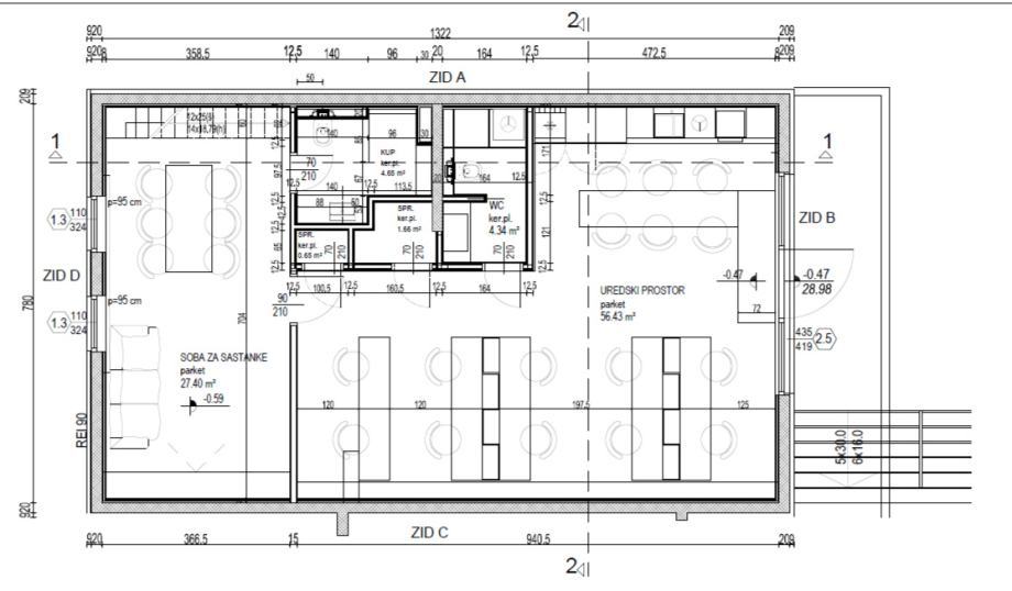 Ukupna površina od 114 m² raspoređena je funkcionalno i pregledno, s naglaskom na učinkovitost i profesionalno okruženje. Prostrani open space omogućuje komforan rad za tim do deset osoba, dok zasebna prostorija za sastanke pruža potrebnu privatnost za susrete s klijentima i poslovnim partnerima. Prostor dodatno obuhvaća potpuno opremljenu kuhinju, server sobu s odgovarajućom infrastrukturom te galeriju s dodatnom prostorijom koja se može koristiti kao ured, arhiva ili prostor za odmor.