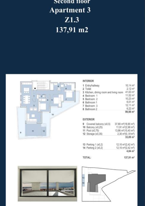 Stan se sastoji od ulaznog hodnika, prostranog dnevnog boravka s kuhinjom i blagovaonicom, WC-a, kupaonice, dvije spavaće sobe te glavne spavaće sobe s privatnom kupaonicom. Iz dnevnog boravka i spavaćih soba izlazi se na prostranu, djelomično natkrivenu terasu, koja vodi do privatnog bazena površine 13,86 m2 i odvojenog lounge prostora idealnog za obiteljska okupljanja. Unutarnja površina stana iznosi 99,98 m2, dok vanjski prostor, uključujući terasu, lounge, vrt i bazen, iznosi 33 m2. Dodatno, stan posjeduje dva parkirna mjesta ukupne površine 25 m2. Ukupna površina stana, uključujući sve navedene prostore, iznosi 137m2